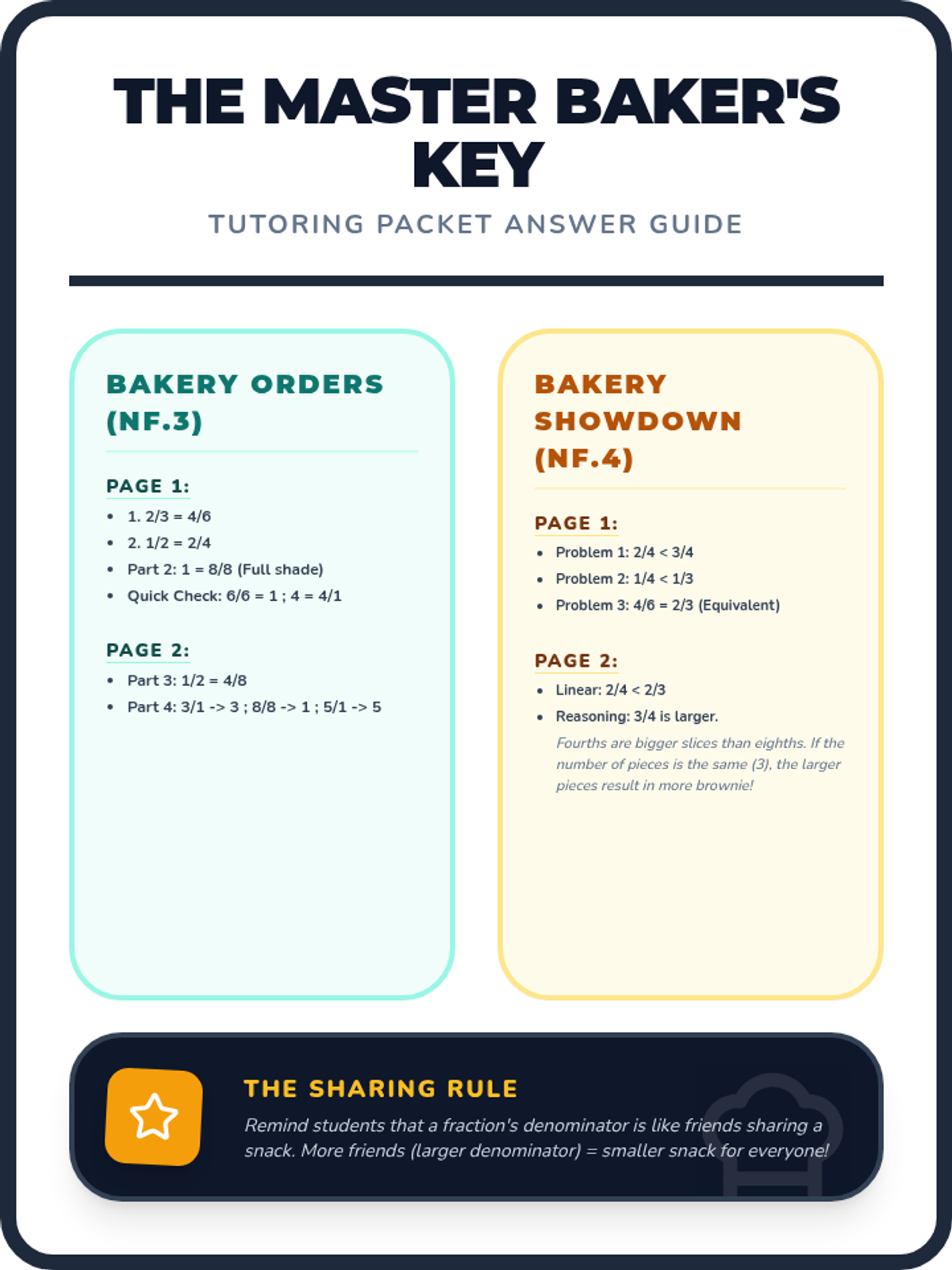 Consolidated answer key for the 'Fraction Bakery' packet, including answers for both the NF.3 and NF.4 independent worksheets and tutoring tips. Simplified text to ensure PDF rendering.