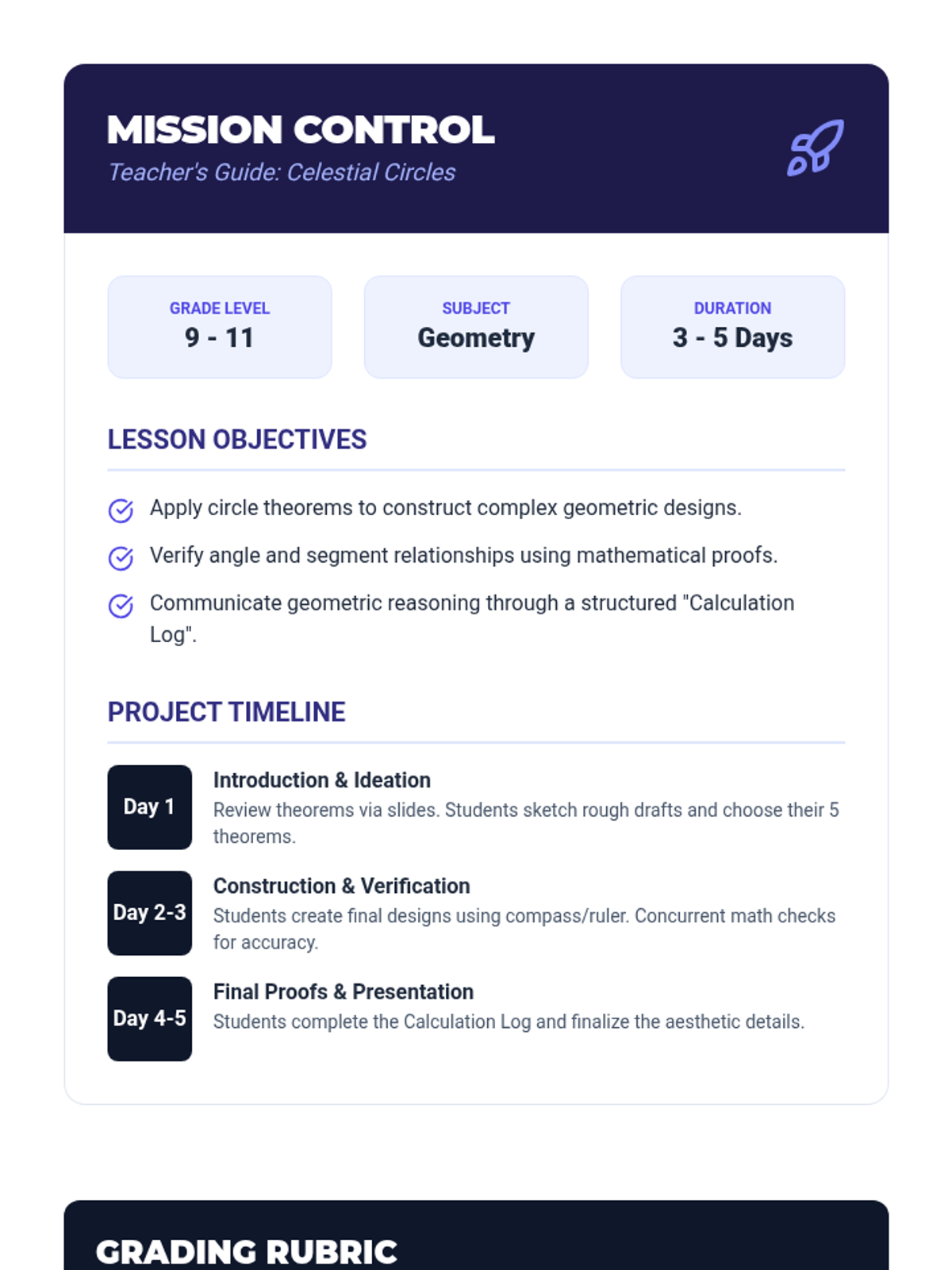 A teacher's guide for the Celestial Circles project, including lesson objectives, a daily project timeline, and a comprehensive grading rubric.