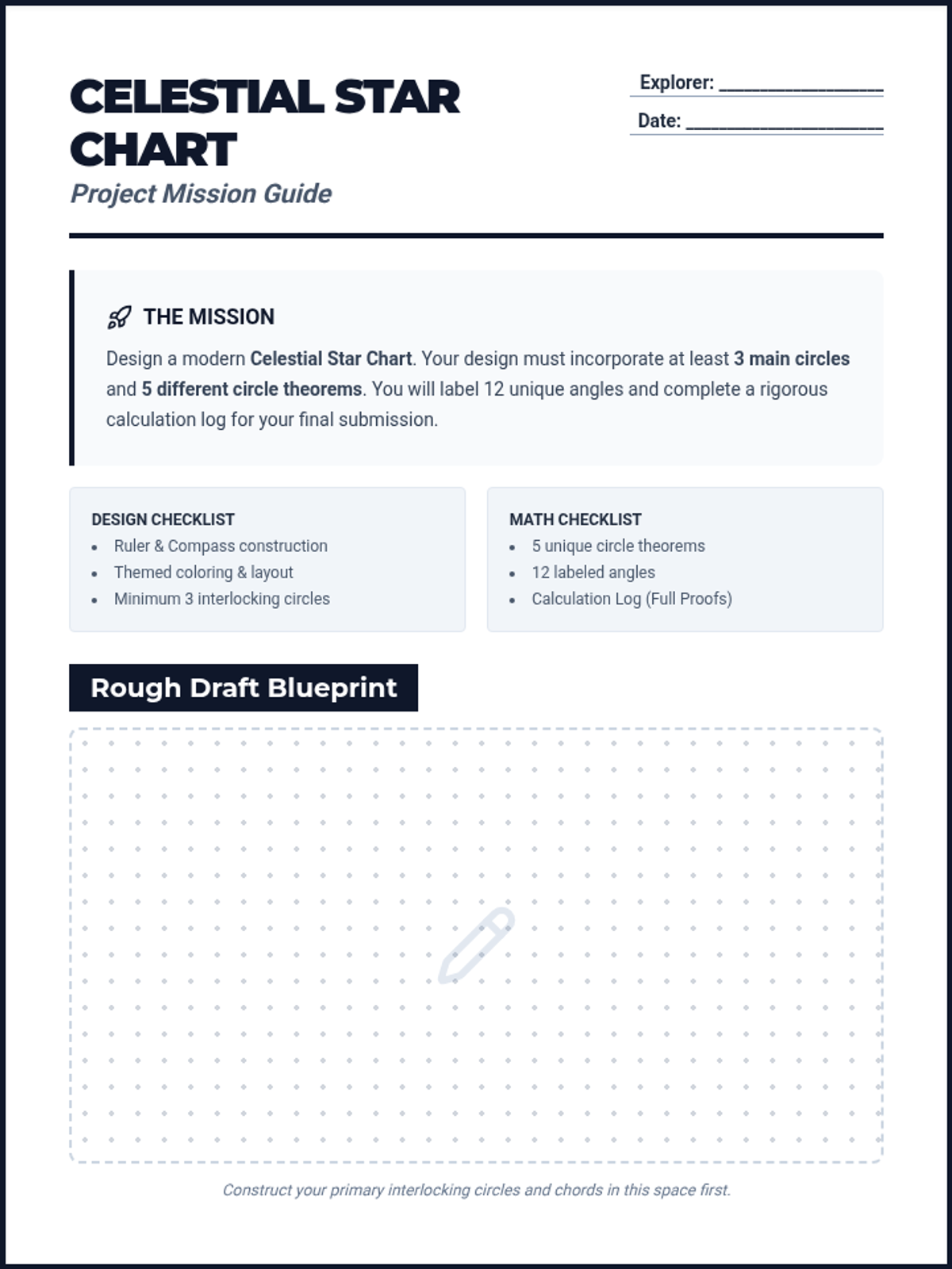 A project guide for students to design a celestial star chart using circle theorems, including design requirements, a drafting space, and a 5-entry calculation log for proofs.