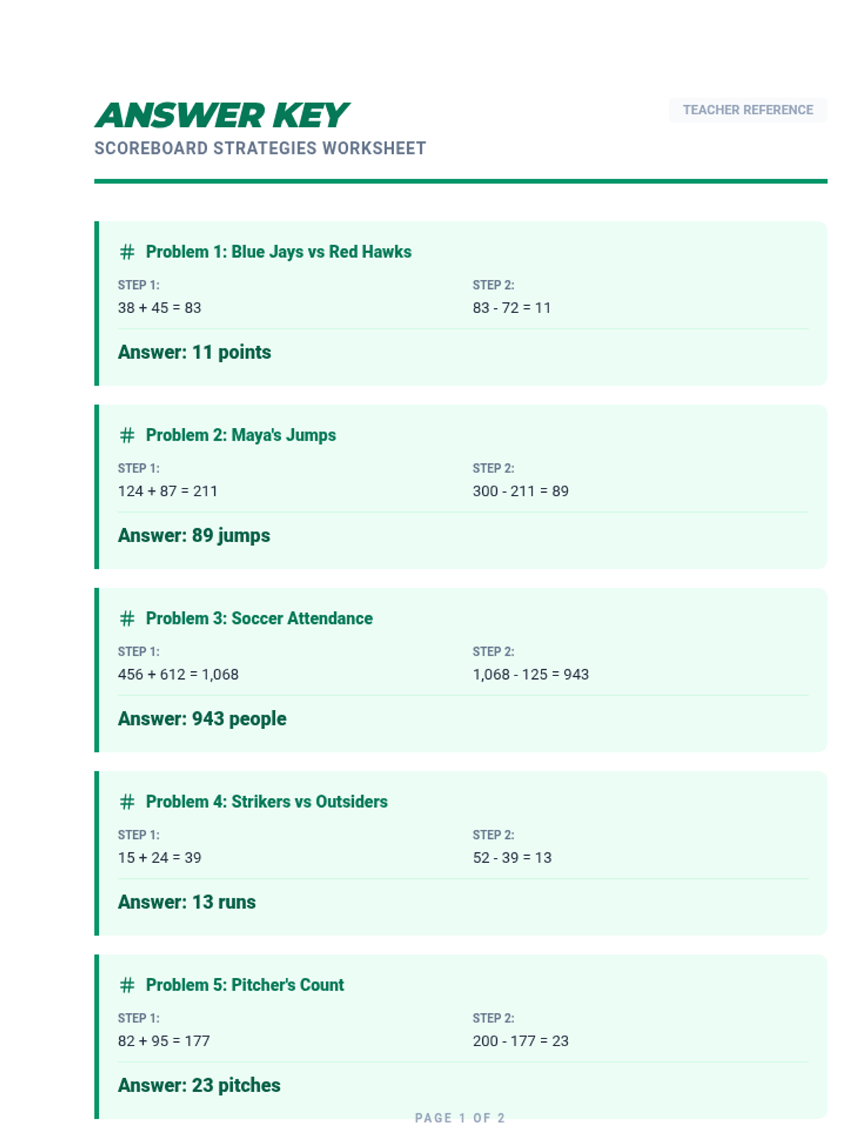 A professionally formatted 2-page answer key strictly optimized for 8.5x11 inch printing. Matches the worksheet's theme and provides clear step-by-step solutions for all 10 problems.