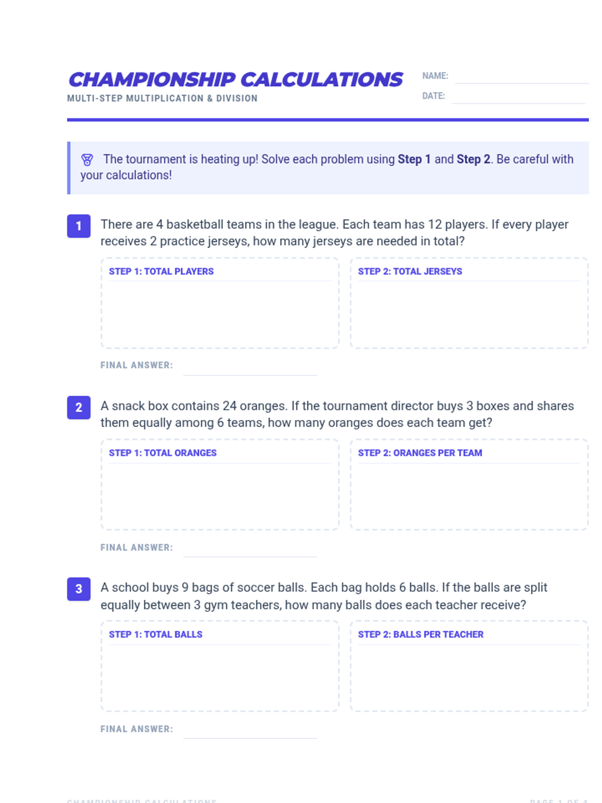 A 4-page worksheet featuring 10 multi-step sports-themed word problems focusing on multiplication and division for 4th graders. Includes graphic organizers for breaking down the steps and a professional, print-optimized layout.
