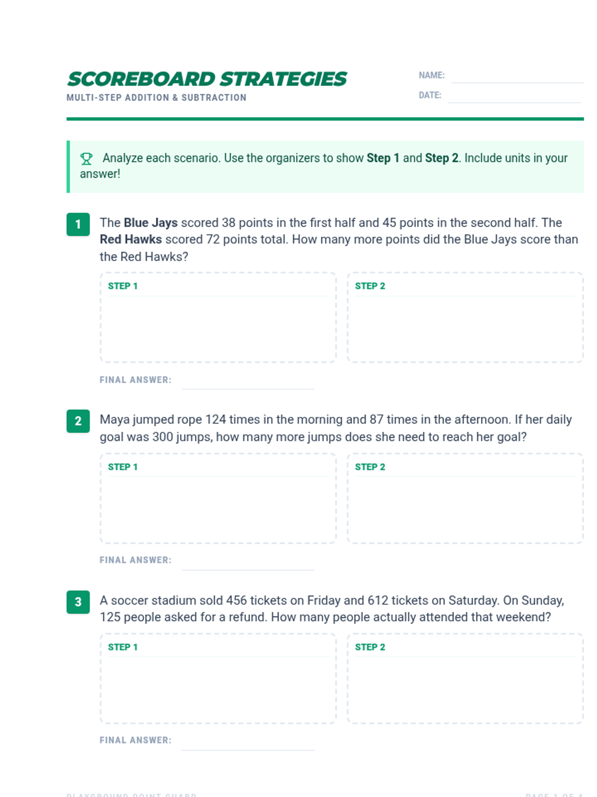 A professionally formatted 4-page worksheet strictly optimized for 8.5x11 inch printing. Features 10 multi-step sports word problems with clear graphic organizers, consistent headers on all pages, and generous handwriting space.