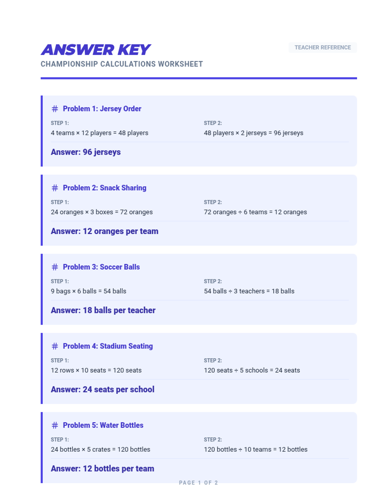 A professionally formatted 2-page answer key for the Championship Calculations Worksheet, featuring step-by-step solutions for 10 multi-step multiplication and division problems.