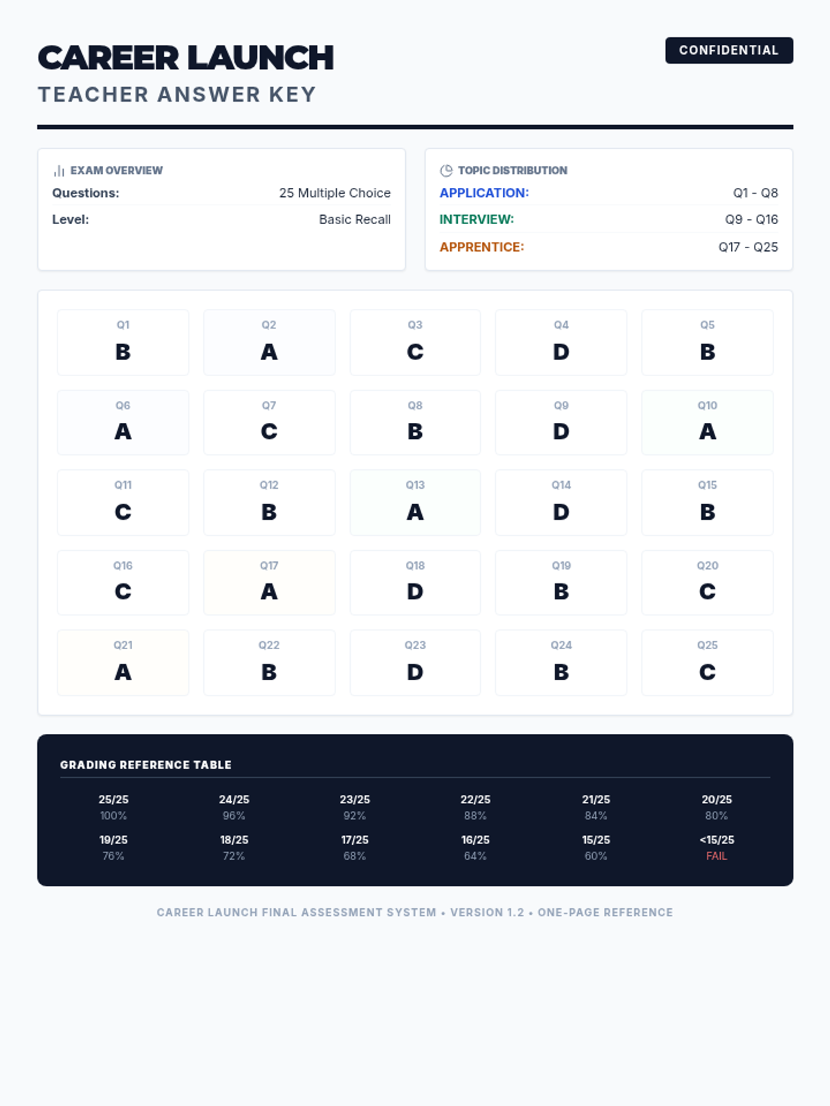 A concise answer key for the Career Launch Final Exam, including a scoring guide and distribution summary for teacher use.