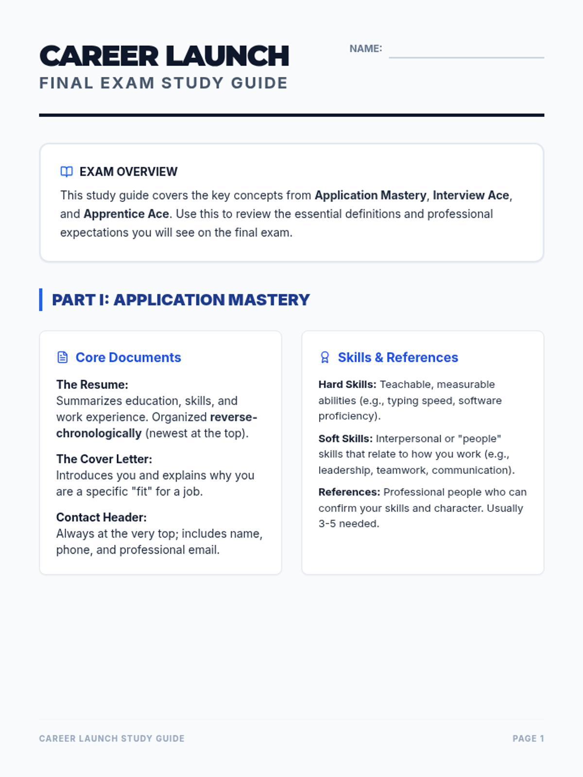 A comprehensive 2-page study guide covering key concepts from Application Mastery, Interview Ace, and Apprentice Ace to prepare students for the final exam.