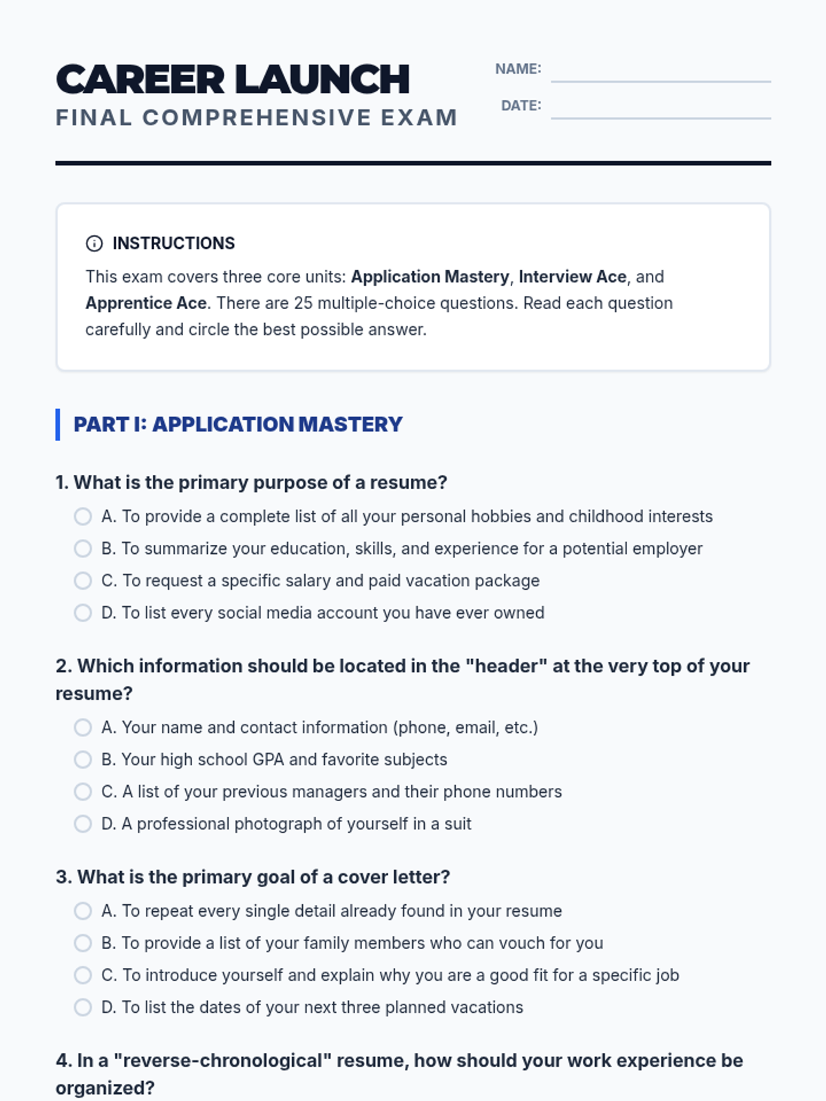 A 25-question multiple-choice final exam covering application mastery, interviewing techniques, and professional workplace etiquette. Designed for basic recall assessment.