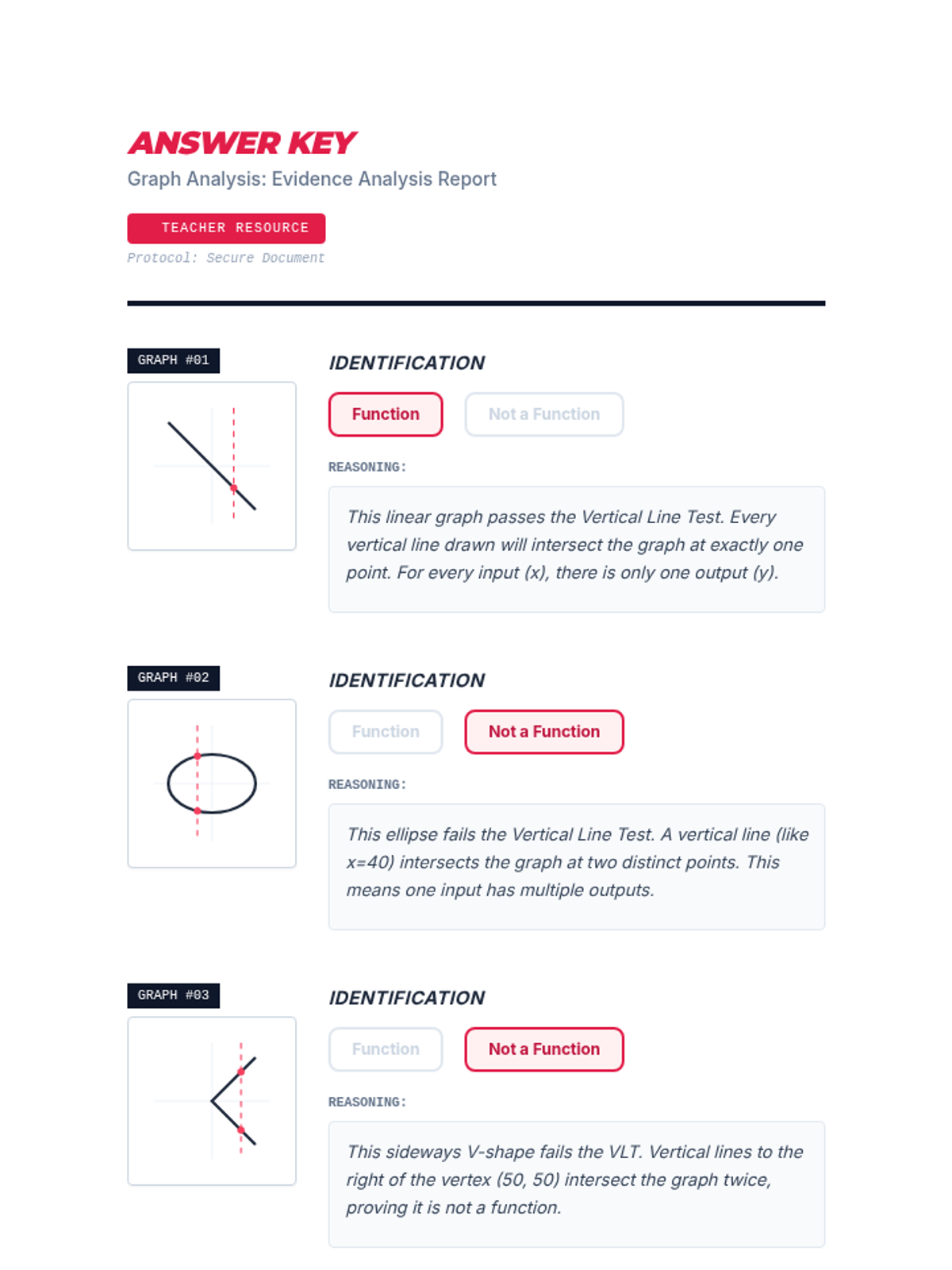 An answer key for the Graph Analysis Worksheet with correctly identified functions, visual VLT indicators, and detailed reasoning for each item.