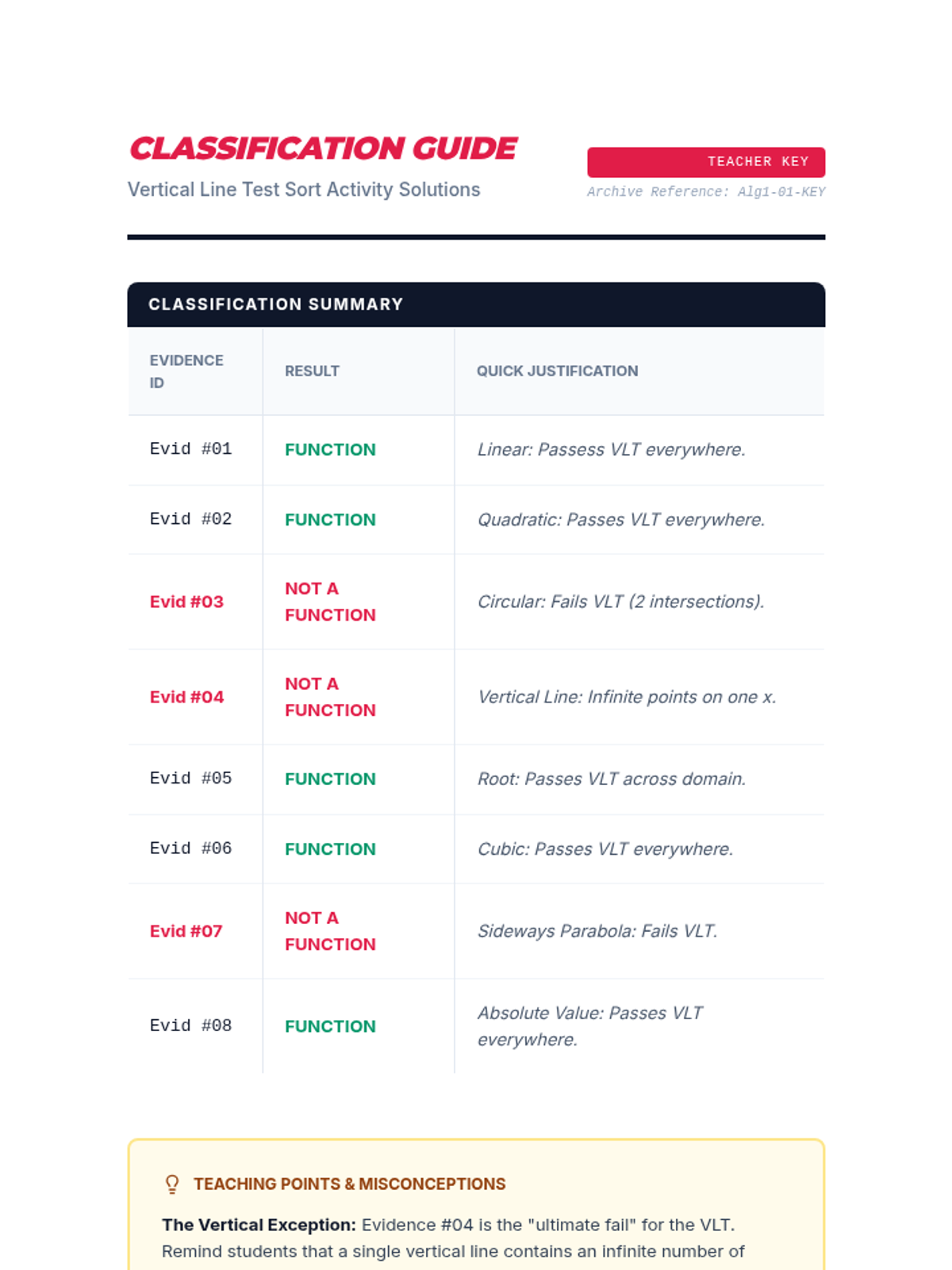 A comprehensive teacher's answer key for the VLT Sort Activity, including classification results, justifications, and instructional tips for common misconceptions.