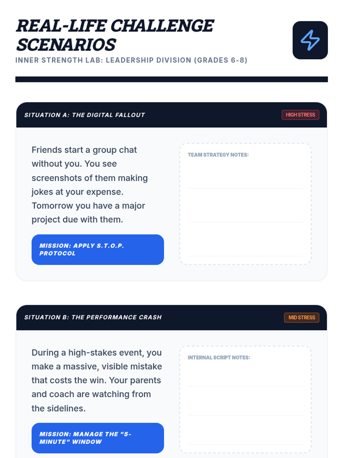 Revised scenario handout for 6th-8th graders. Added dedicated student response areas for each situation, fixed page break issues with 'break-inside-avoid', and included a S.T.O.P. protocol reference for self-contained usability.