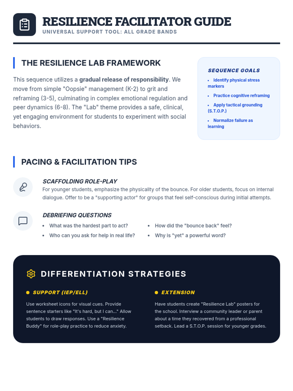 Revised facilitator guide. Fixed page break issues in the differentiation section by using 'break-inside-avoid'. Optimized layout and spacing to ensure all content fits professionally on a single page.
