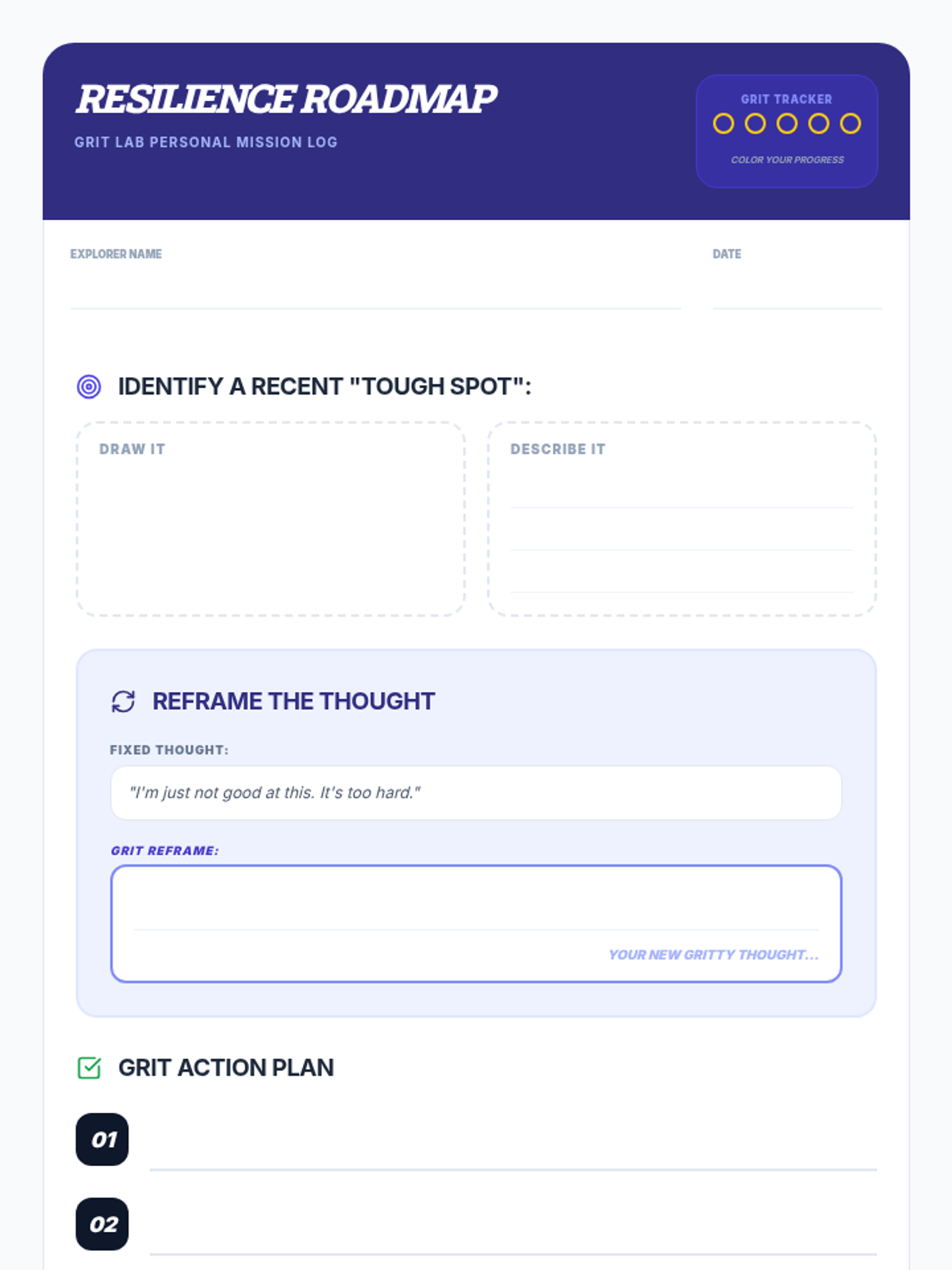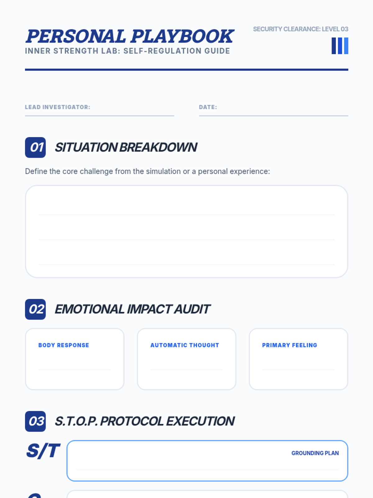 Revised worksheet for 6th-8th graders. Fixed page break issues for Section 3, increased height for emotional audit boxes (min-h-120px), and added input lines for S.T.O.P. execution steps. Improved overall tracking and legibility.