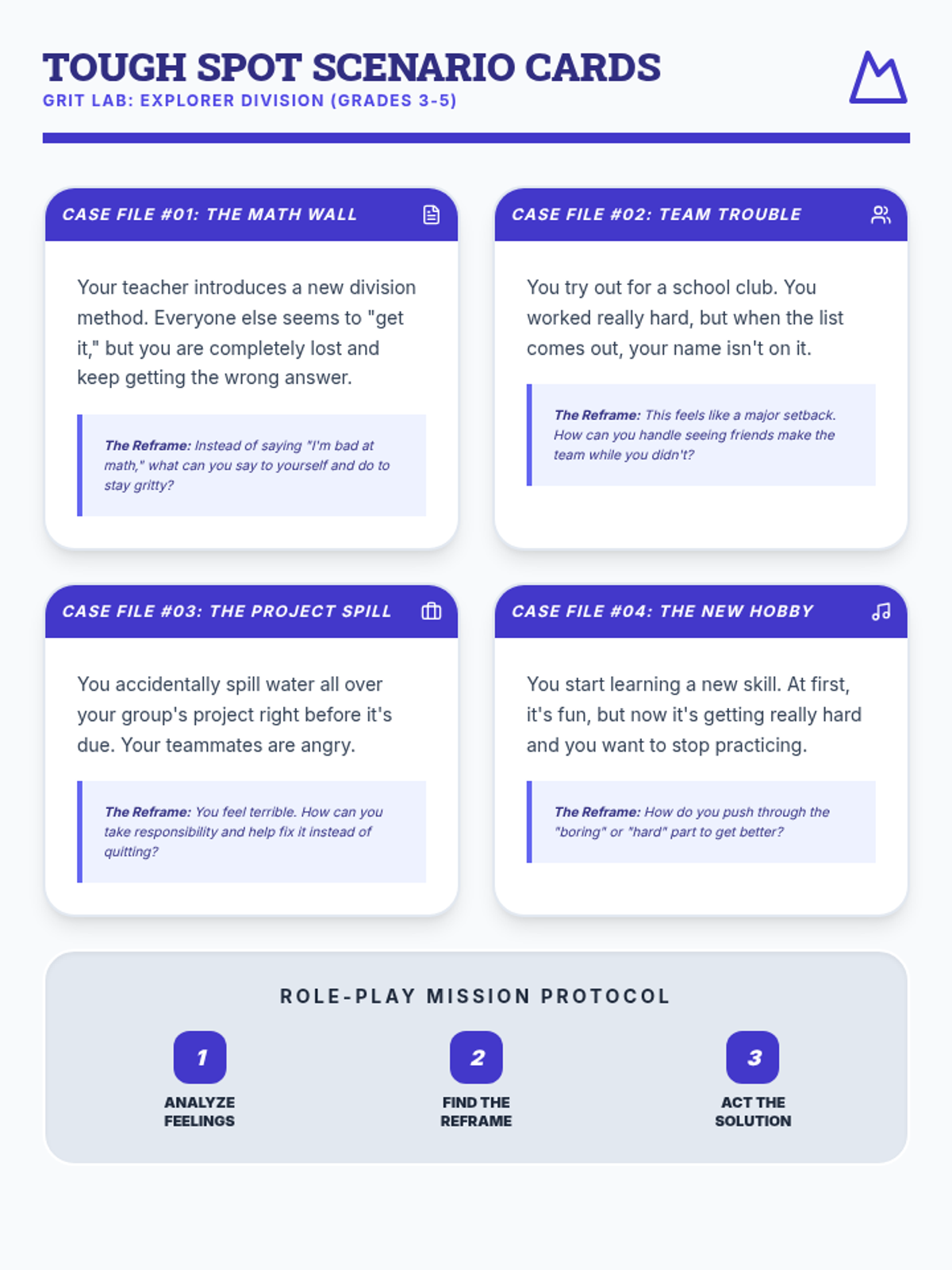 Revised scenario cards for 3rd-5th graders with fluid height containers to ensure no text is truncated. Improved visual design for instructions and consistent card layout. Final revision to fix footer page break and text sizing.