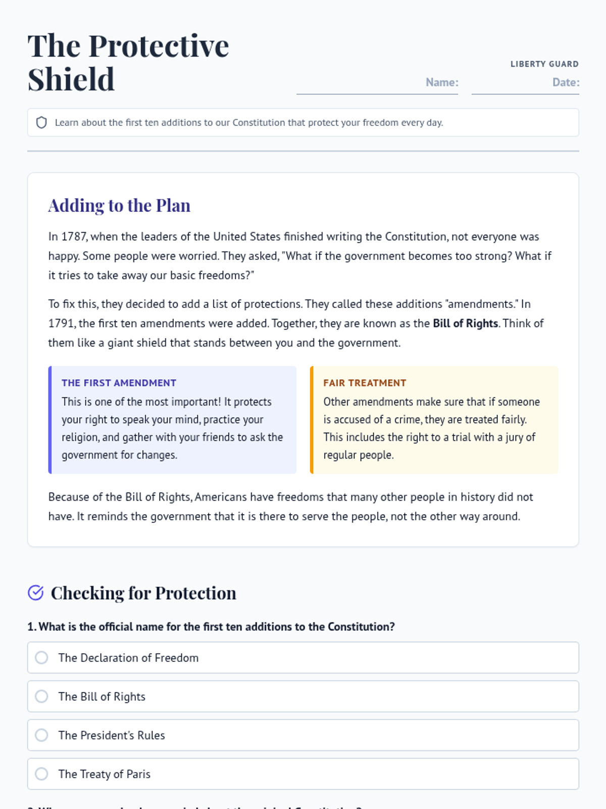A reading passage and multiple-choice quiz introducing the basic concept of the Bill of Rights as a list of protections for individual freedoms. Explicit grade level labels are removed for students. Revised for minor header polish and page layout.