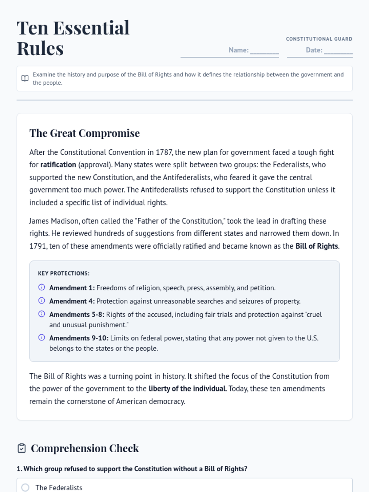 A reading passage and multiple-choice quiz exploring the origin and key amendments of the Bill of Rights, focusing on the compromise between Federalists and Antifederalists. Grade level labels are removed for students. Revised for minor header polish and page layout.