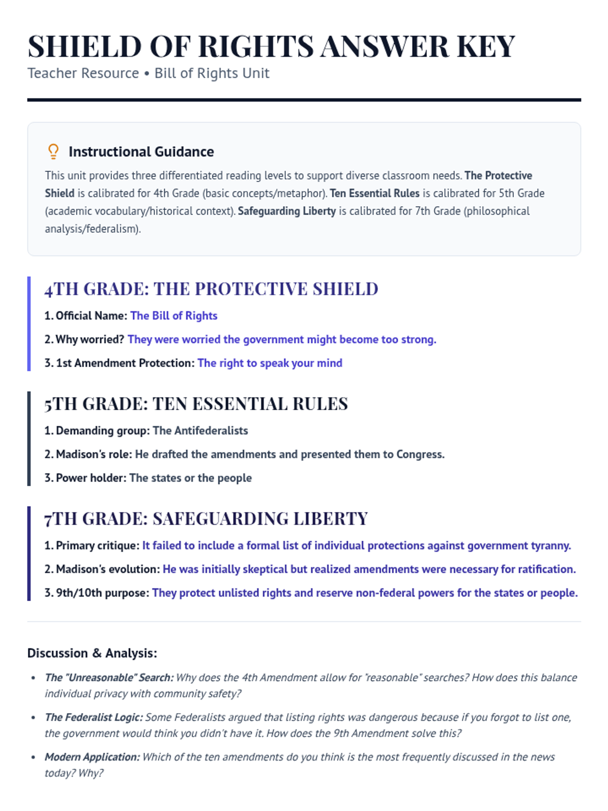 A comprehensive answer key for all three differentiated reading worksheets about the Bill of Rights, including instructional guidance for 4th, 5th, and 7th grade levels.