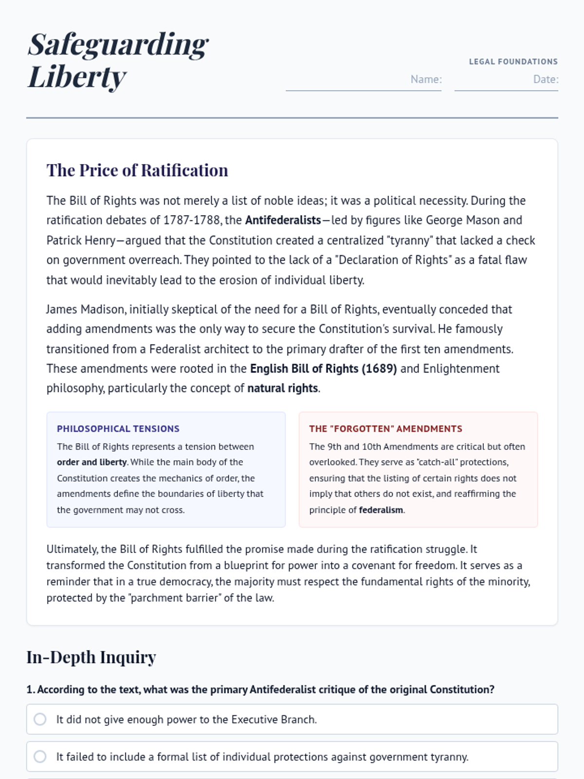 A sophisticated reading passage and quiz exploring the political struggle for the Bill of Rights, the role of Federalists and Antifederalists, and the philosophical purpose of the 9th and 10th Amendments. Grade labels are removed for students.