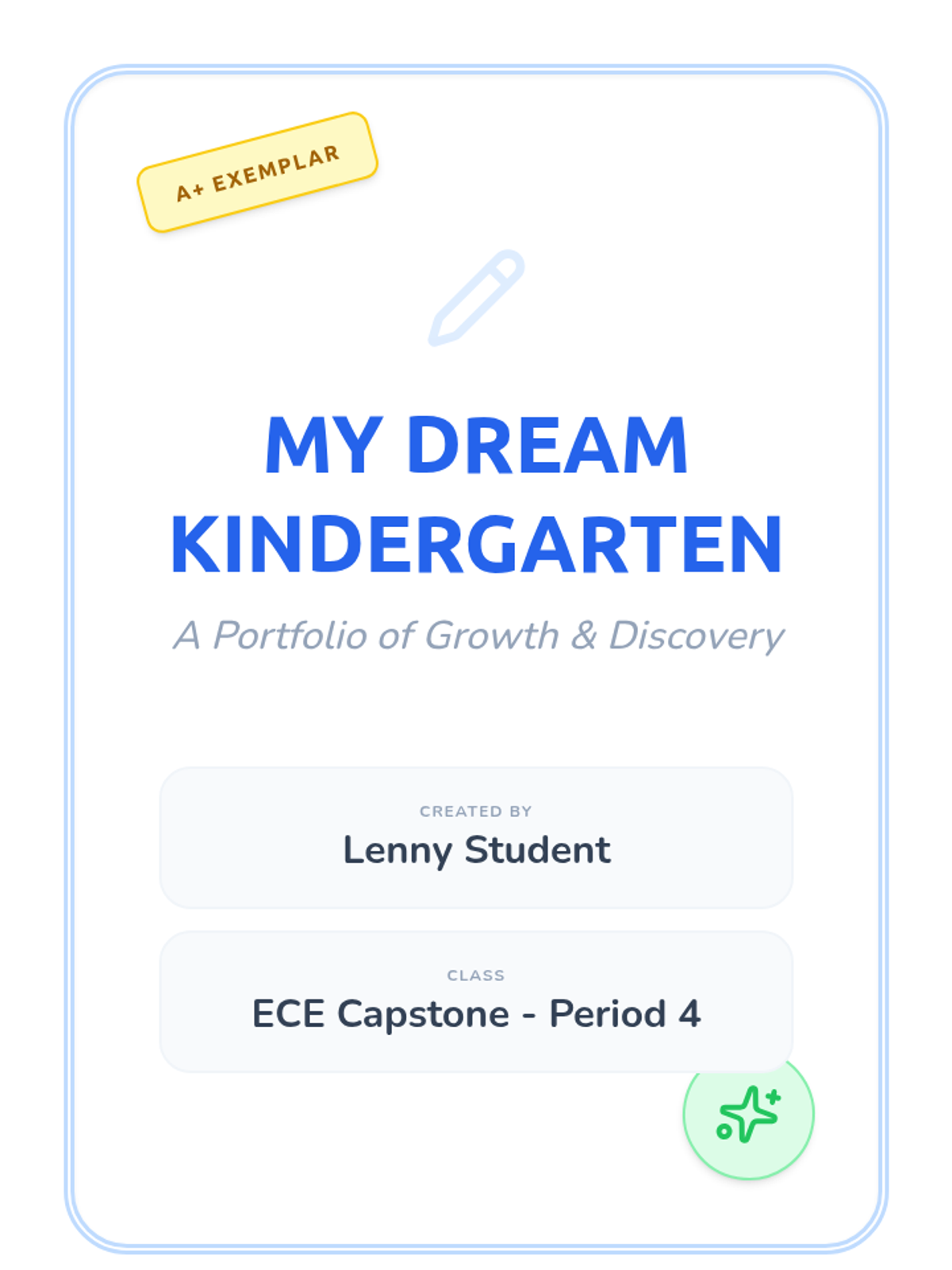 An exemplary completed project for the Kindergarten Portfolio Project, showcasing a high-quality classroom vision, layout rationale, daily schedule, and sample lesson plans for student reference.