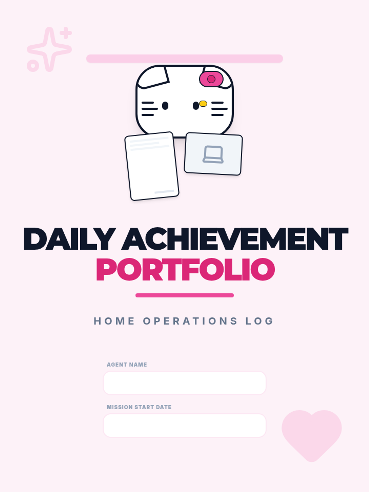 A sophisticated, Hello Kitty-themed achievement portfolio for an 11-year-old. Features a custom cover graphic with whiskers, a neutral but visually appealing pink-and-slate aesthetic, and integrated accountability logs.