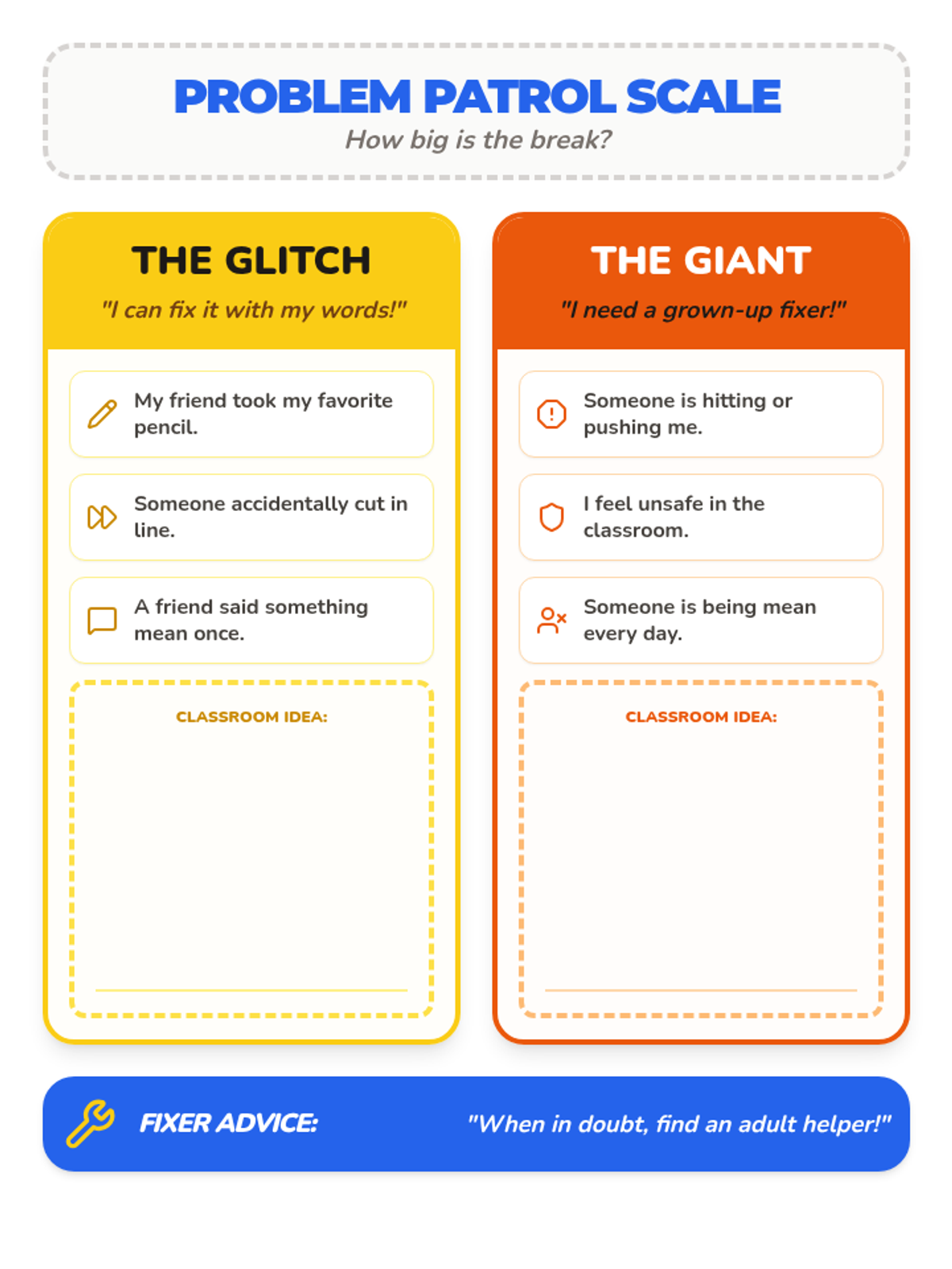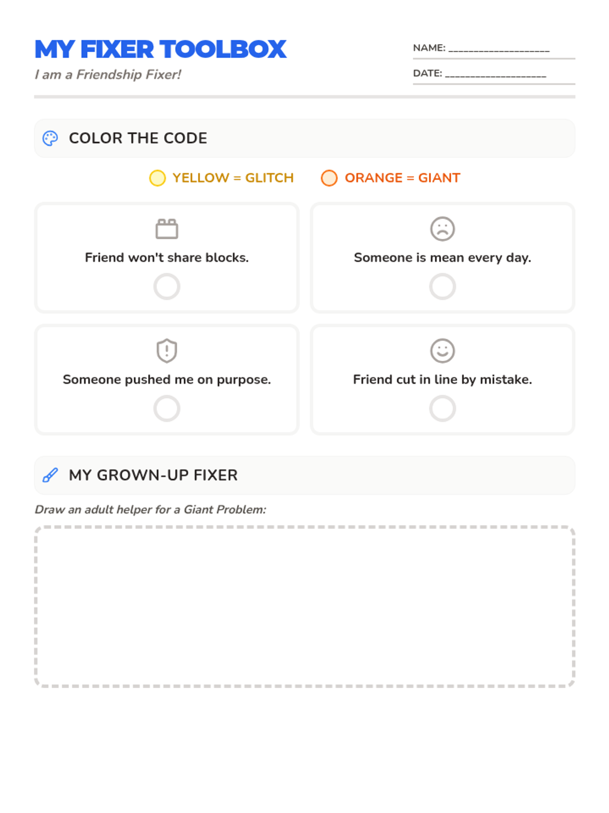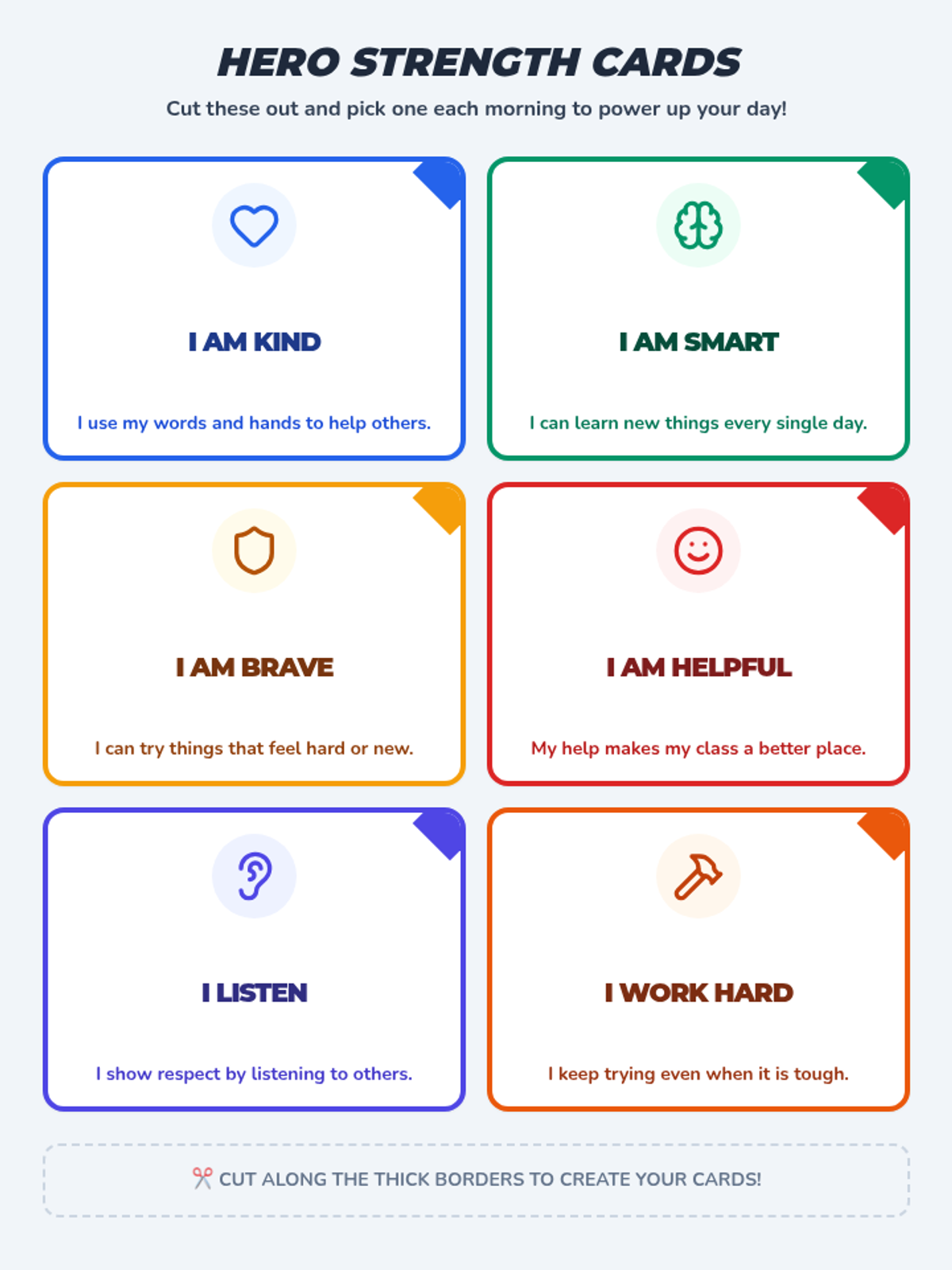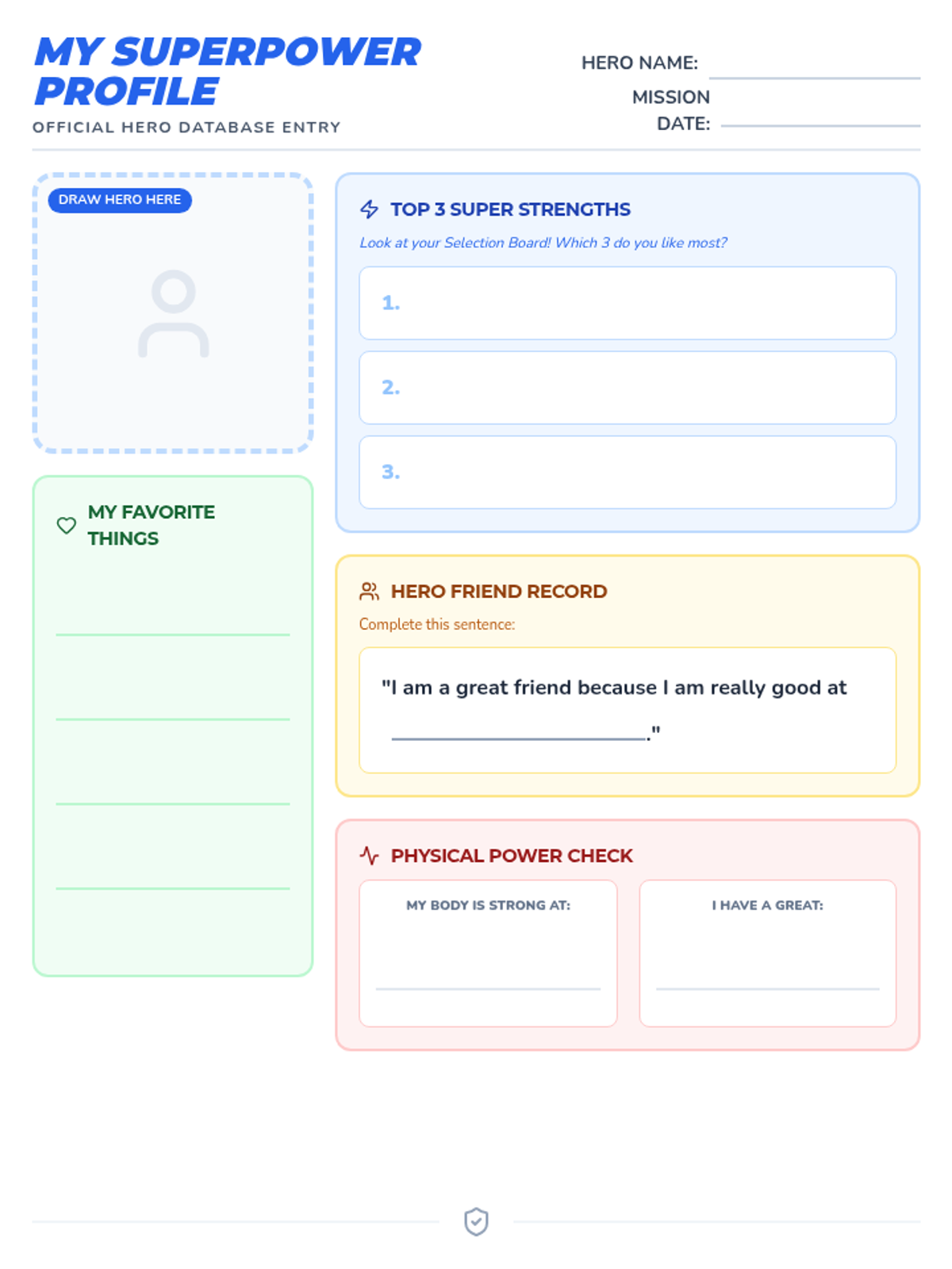 A companion worksheet to the Selection Board where students create their "Superpower Profile." It includes spaces for a self-portrait, identifying top strengths, sharing interests, and reflecting on social and physical attributes. Re-formatted to fit a single page with enlarged handwriting areas.