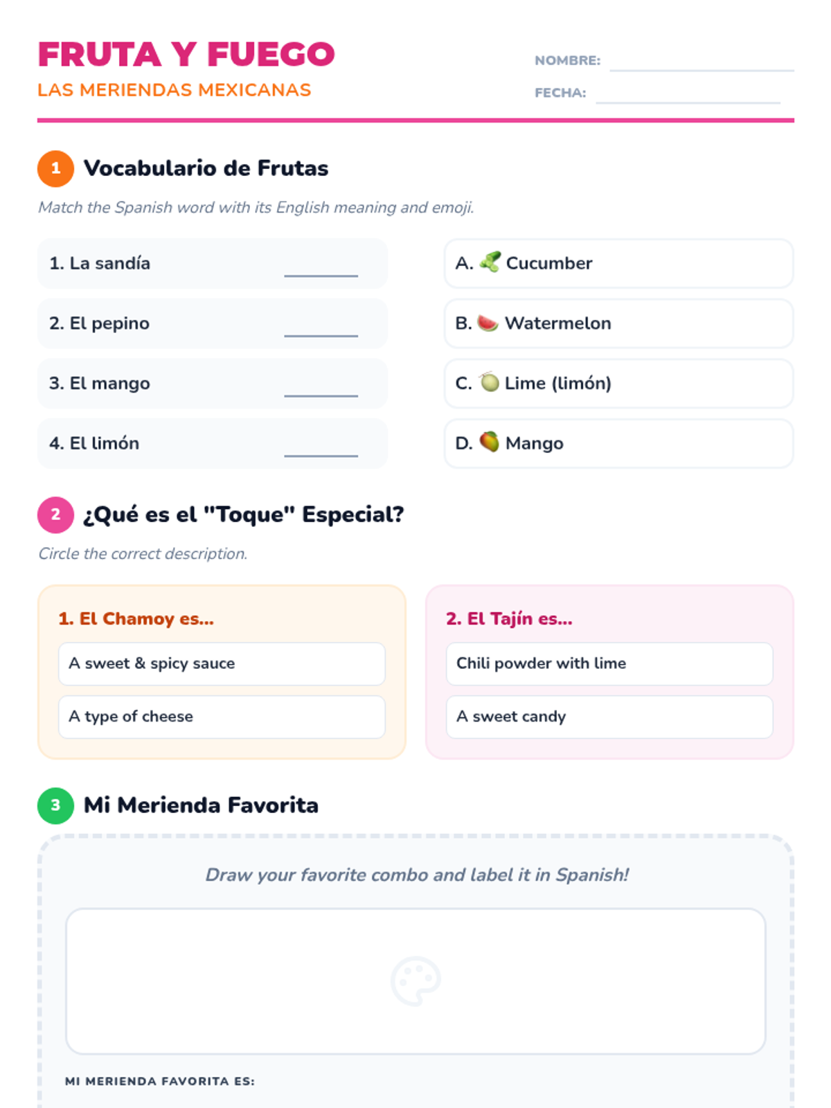 A beginner-level Spanish worksheet for students to practice vocabulary matching, ingredient identification, and creative expression related to Mexican fruit snacks.