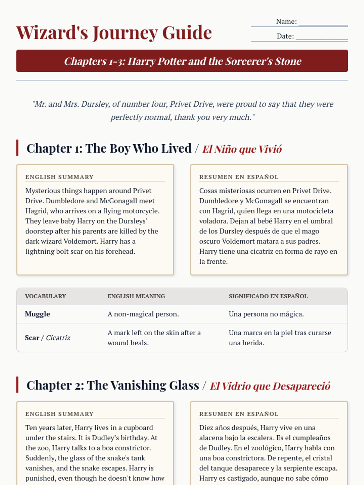 A bilingual (English/Spanish) study guide for the first three chapters of Harry Potter and the Sorcerer's Stone, featuring side-by-side plot summaries and vocabulary tables.