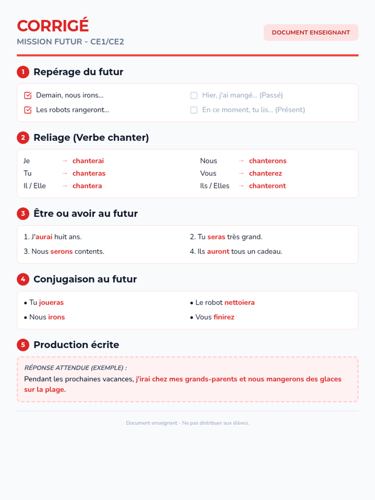 Fiche d'exercices sur le futur simple pour les élèves de CE1-CE2, incluant des exercices d'identification, de reliage, de complétion (être/avoir) et de production écrite. Version corrigée avec mise en page optimisée sur 2 pages.