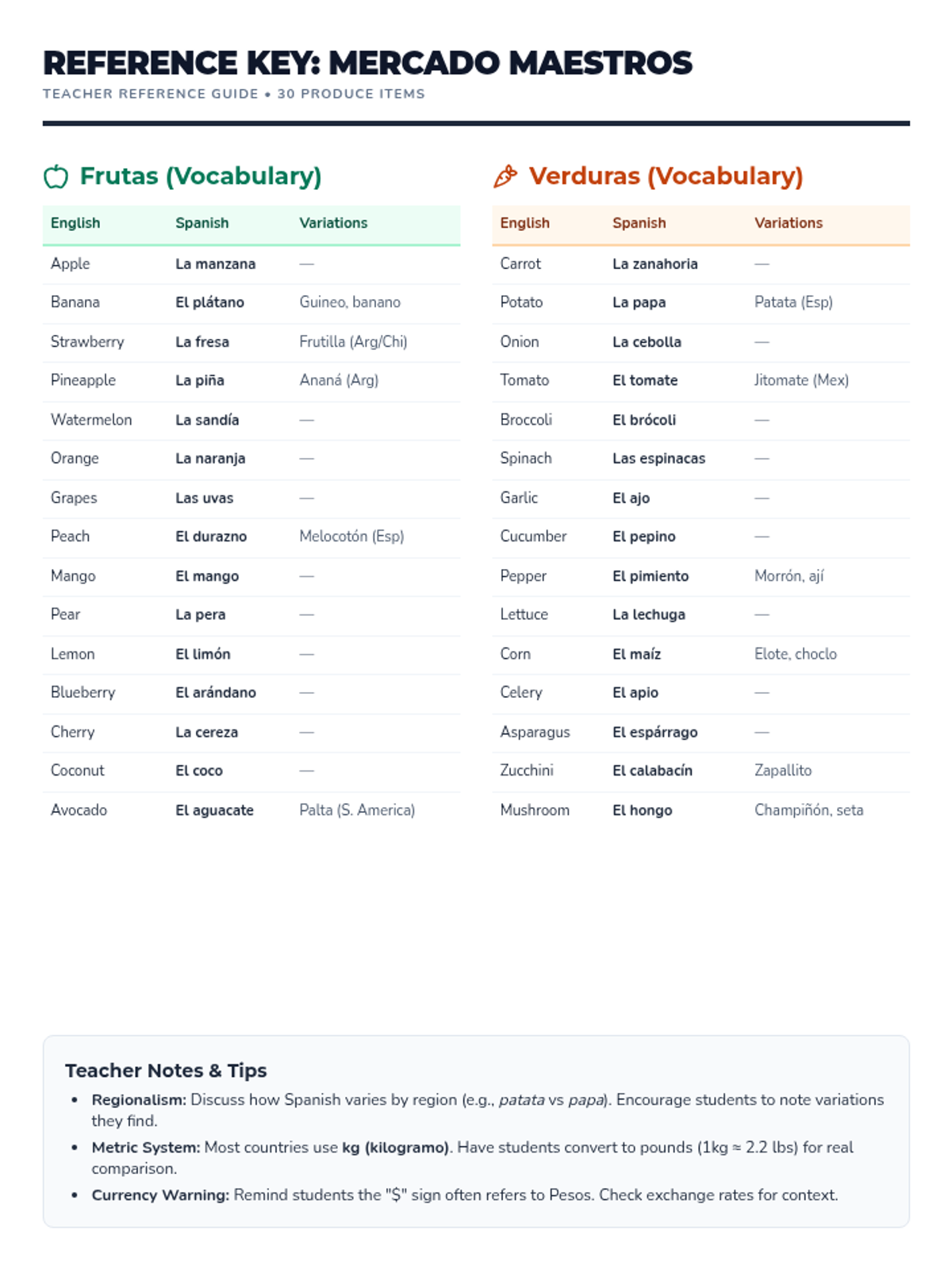 A reference guide for teachers containing the vocabulary for all 30 fruits and vegetables, including regional variations and teaching tips for the project.