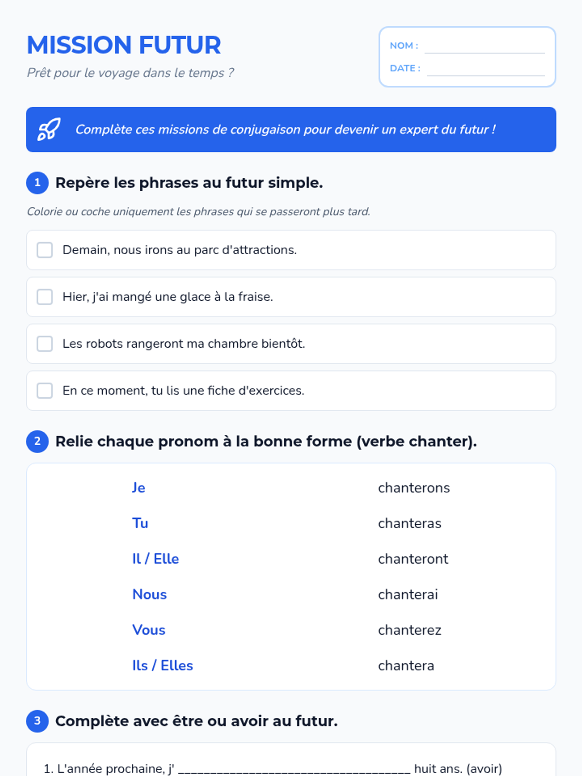 Présentation interactive complète sur le futur simple pour CE1-CE2. Inclut la règle des verbes en -er, les auxiliaires être et avoir, et 3 défis flash interactifs. Style uniforme pour les réponses.