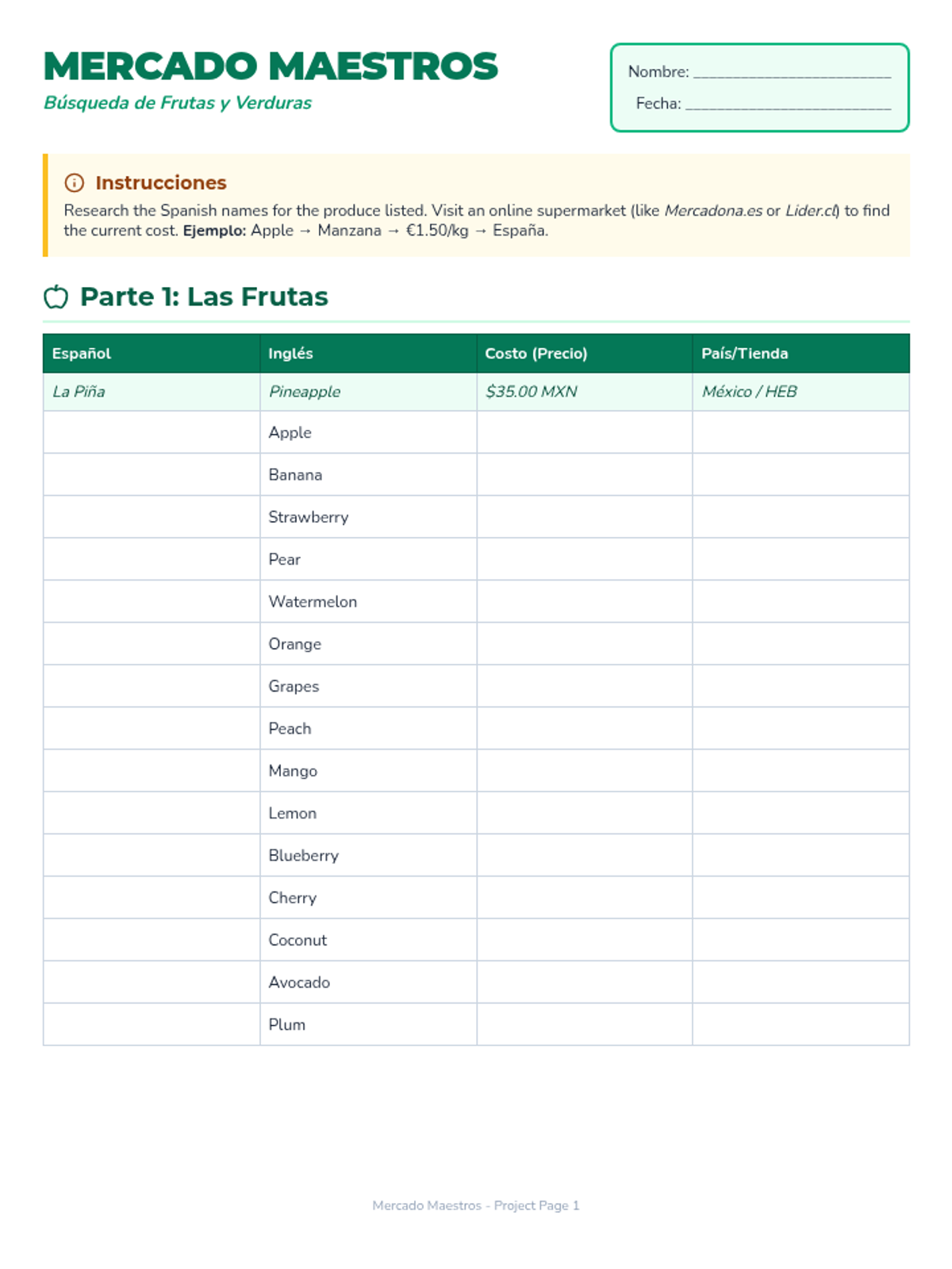 A two-page research worksheet for students to identify 30 Spanish produce terms and find their real-world prices in various Spanish-speaking countries.