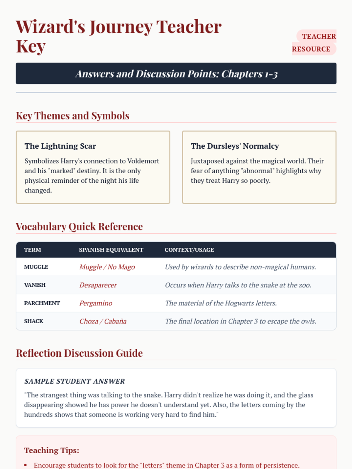 A teacher's reference key for the Chapters 1-3 bilingual study guide, including discussion points on themes, symbols, and vocabulary context.