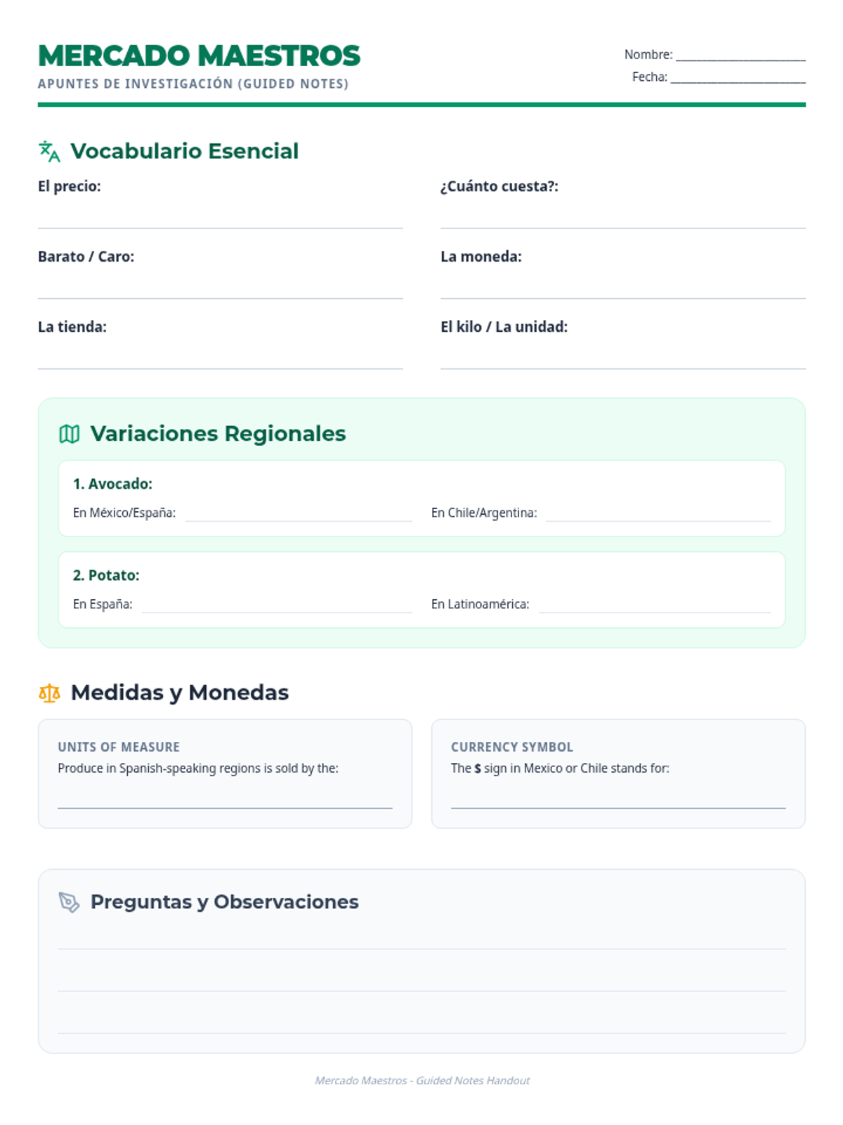 Guided notes for students to use during the introductory slides, covering essential vocabulary, regional variations, and research tips.