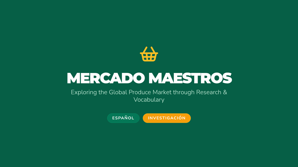 Instructional slides for the Mercado Maestros project, featuring examples, research tips, and international grocery store suggestions.