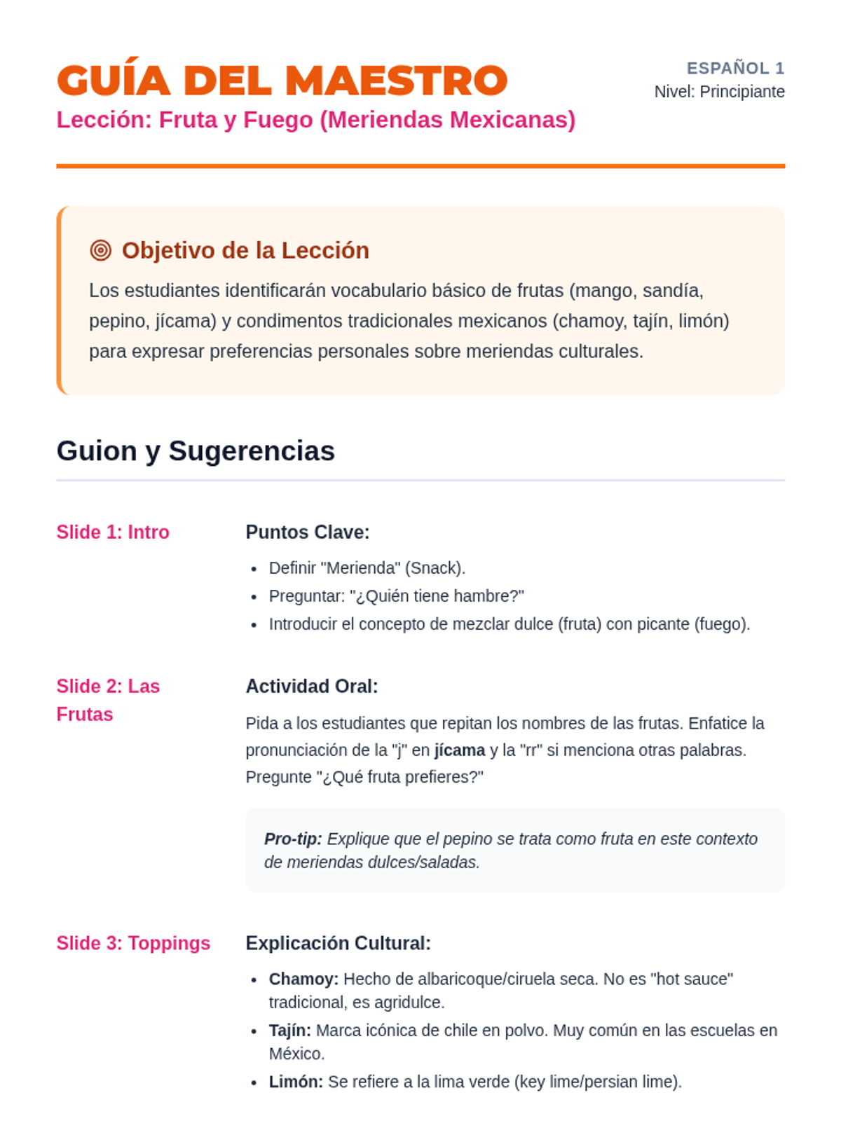 An instructional guide for teachers providing scripts, cultural context, and discussion prompts to accompany the 'Fruta y Fuego' slides.