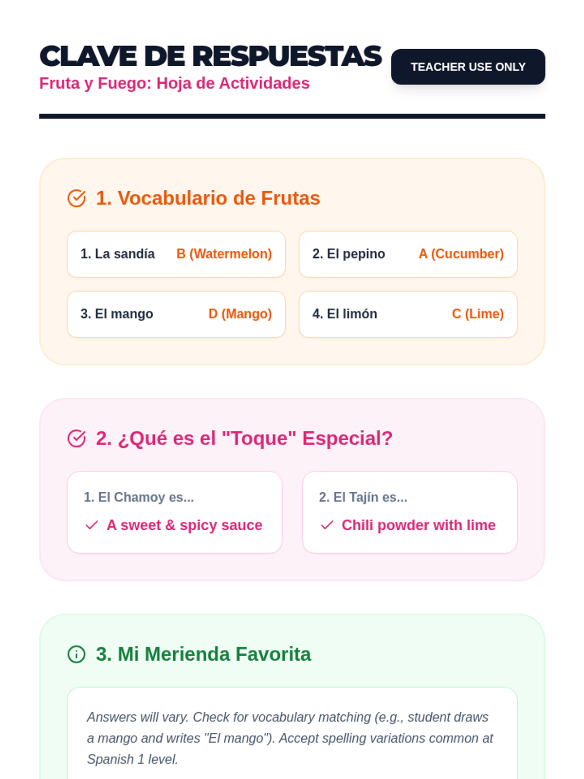 The answer key for the 'Fruta y Fuego' worksheet, providing correct matches and example responses for teacher grading.