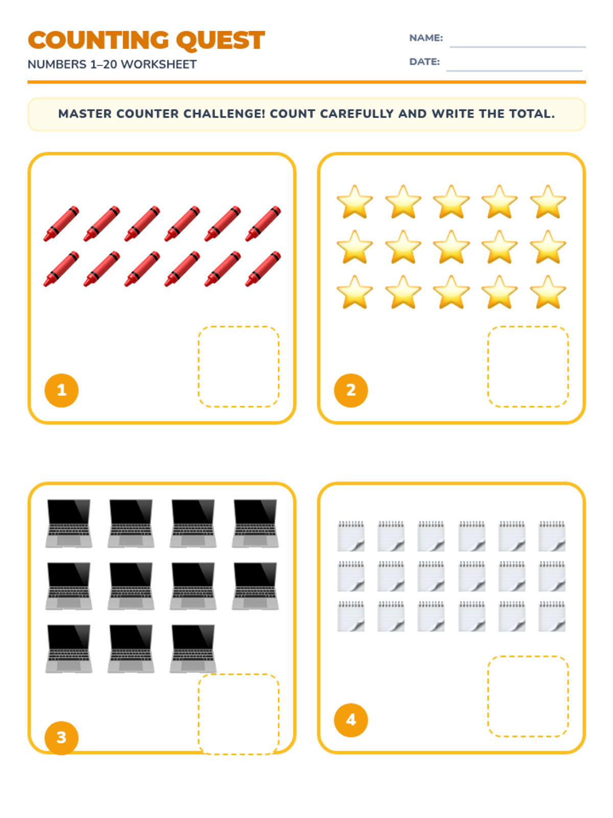 Teacher's answer key for both the 1-10 and 1-20 Counting Quest worksheets, featuring clear numerical answers for quick grading.