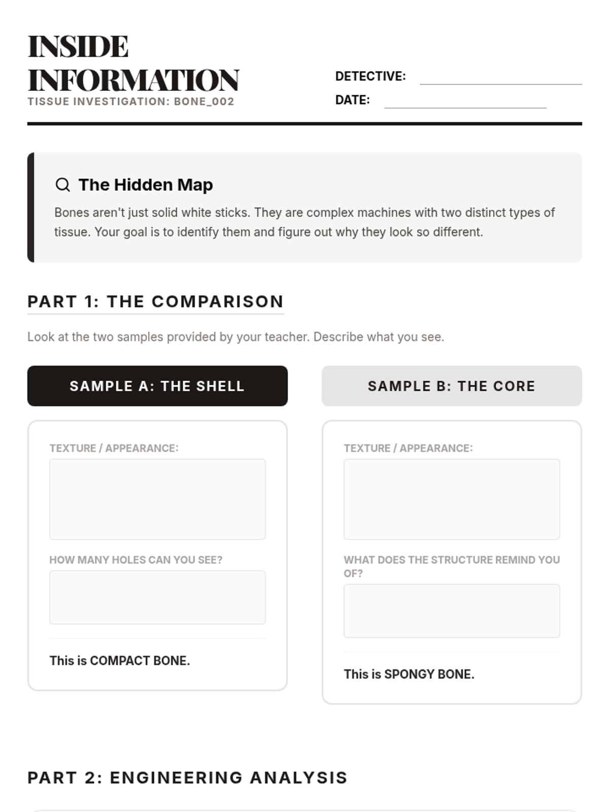 Inquiry-based activity sheet where students compare compact and spongy bone, focusing on structural observations and functional analysis.