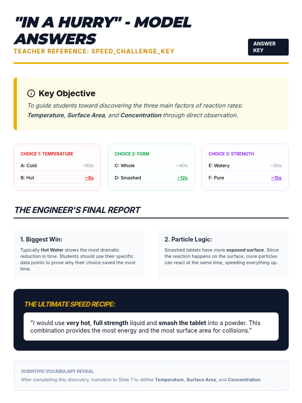 Model answers for the "In a Hurry" Activity, including typical timing data and logical explanations for the effects of temperature, surface area, and concentration.