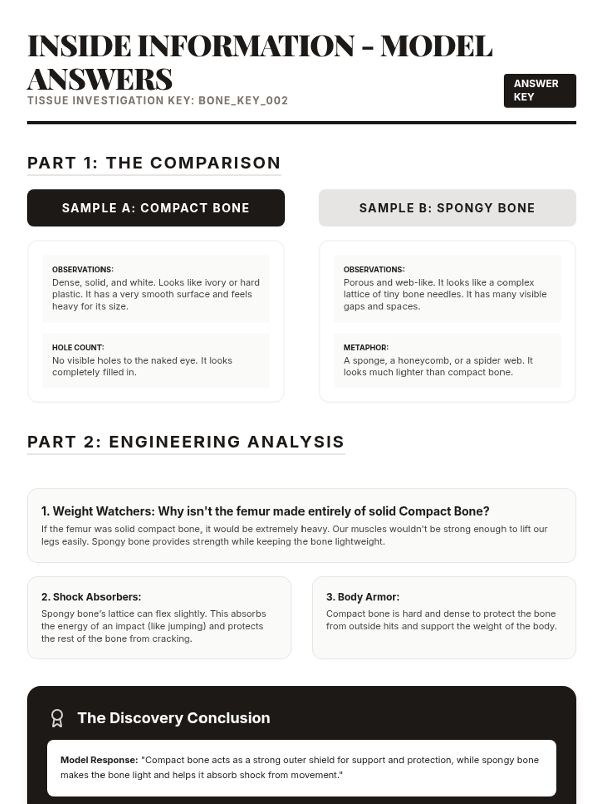 Model answers for the Bone Discovery Activity, detailing the structural characteristics of compact and spongy bone and explaining their functional importance.