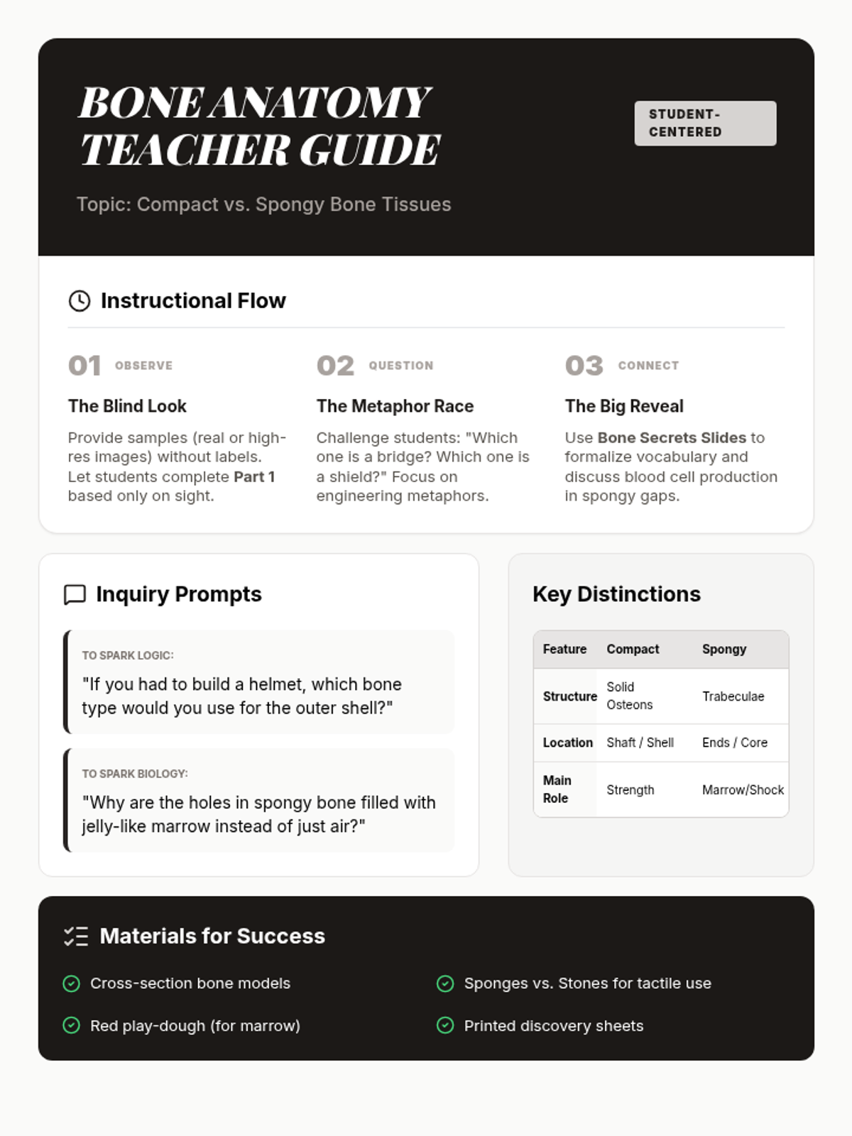 Facilitator's guide for a student-centered bone anatomy lesson, including inquiry prompts, instructional pacing, and a comparative framework.