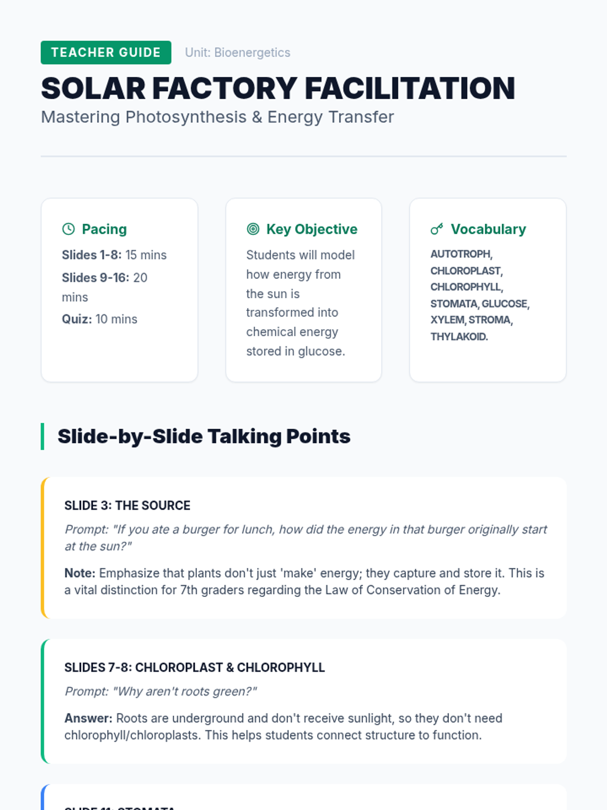 A facilitation guide for teachers covering the Solar Factory lesson. Includes slide-by-slide talking points, common misconceptions, pacing suggestions, and a full answer key for the student notes.