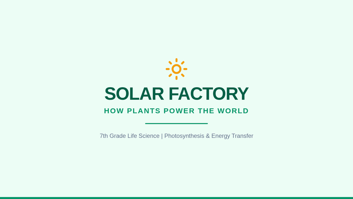 A 20-slide presentation on photosynthesis for 7th grade, highlighting energy transfer from the sun, leaf anatomy, and the chemical equation. Includes a visual review quiz at the end.