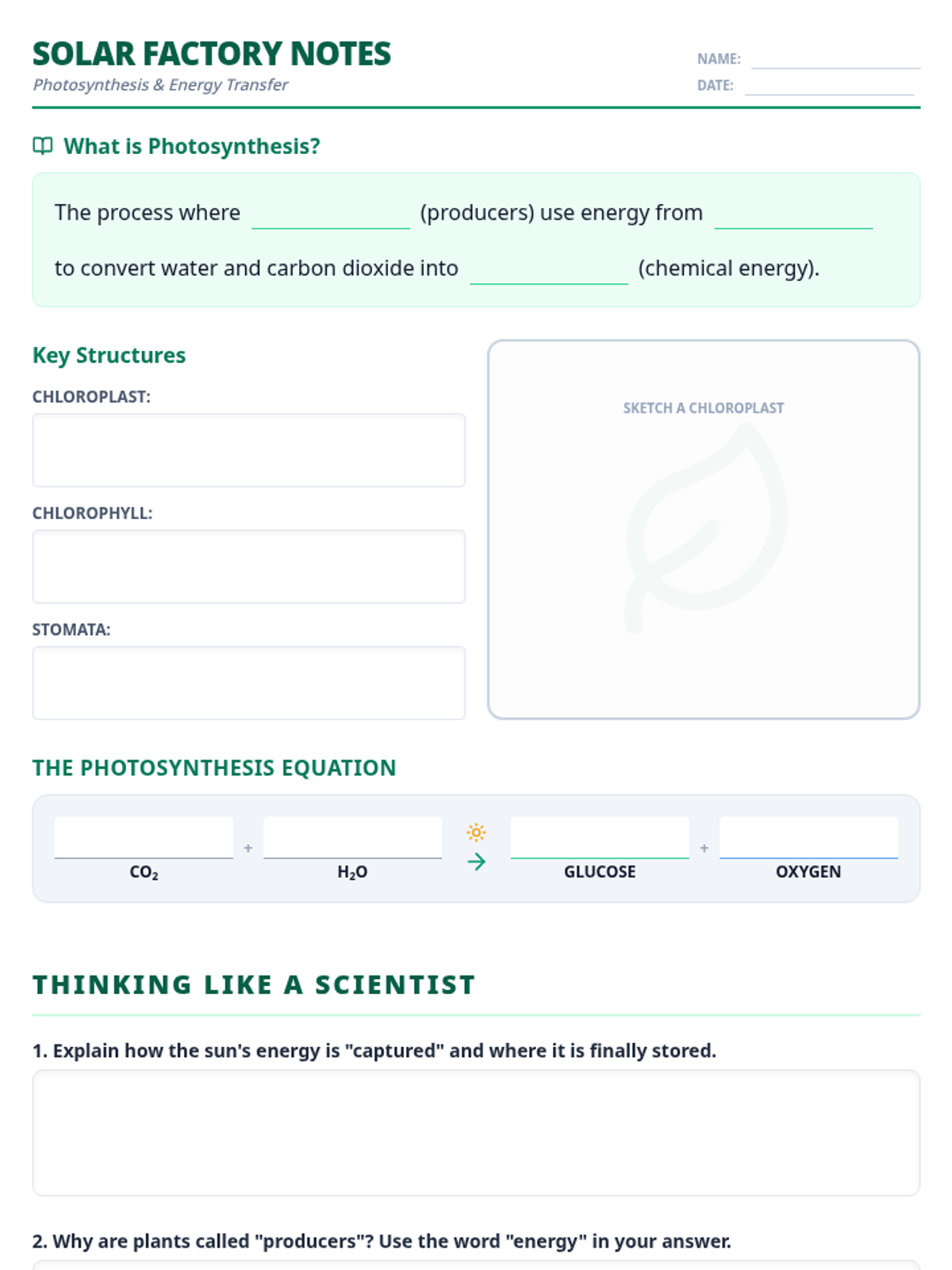A guided note-taking worksheet for students to use during the Solar Factory presentation. Includes sections for definitions, leaf anatomy labeling, and the chemical equation.