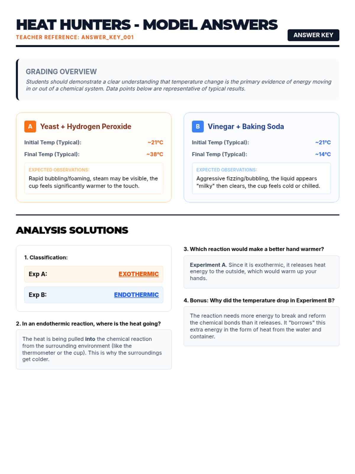 Model answers for the Heat Hunters Lab, providing expected temperature data, classifications, and explanations for energy changes.