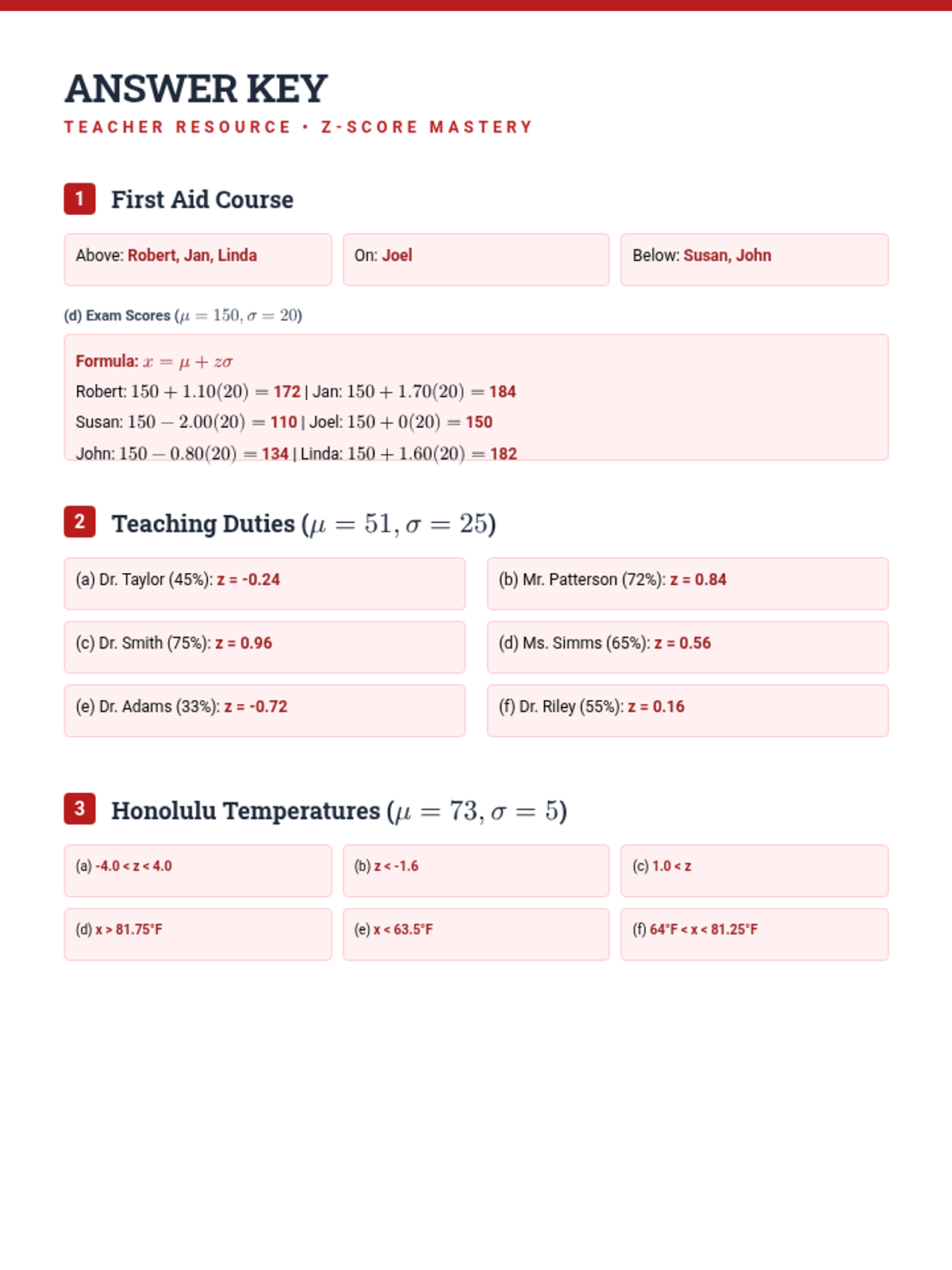 A comprehensive teacher's answer key for the Stat Sense Worksheet, including step-by-step calculation formulas and final results for z-scores, raw values, and distribution interpretations.