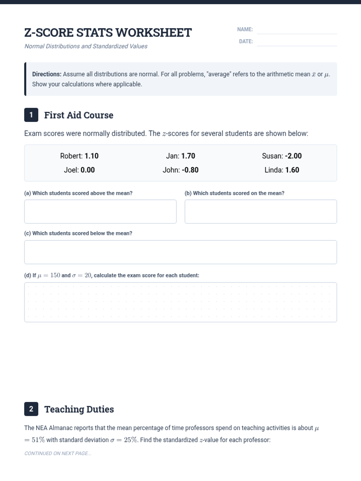 A 4-page statistics worksheet featuring five detailed word problems on z-scores and normal distributions. Includes sections on first aid exams, teaching hours, regional temperatures, and wildlife population data with ample space for calculations.