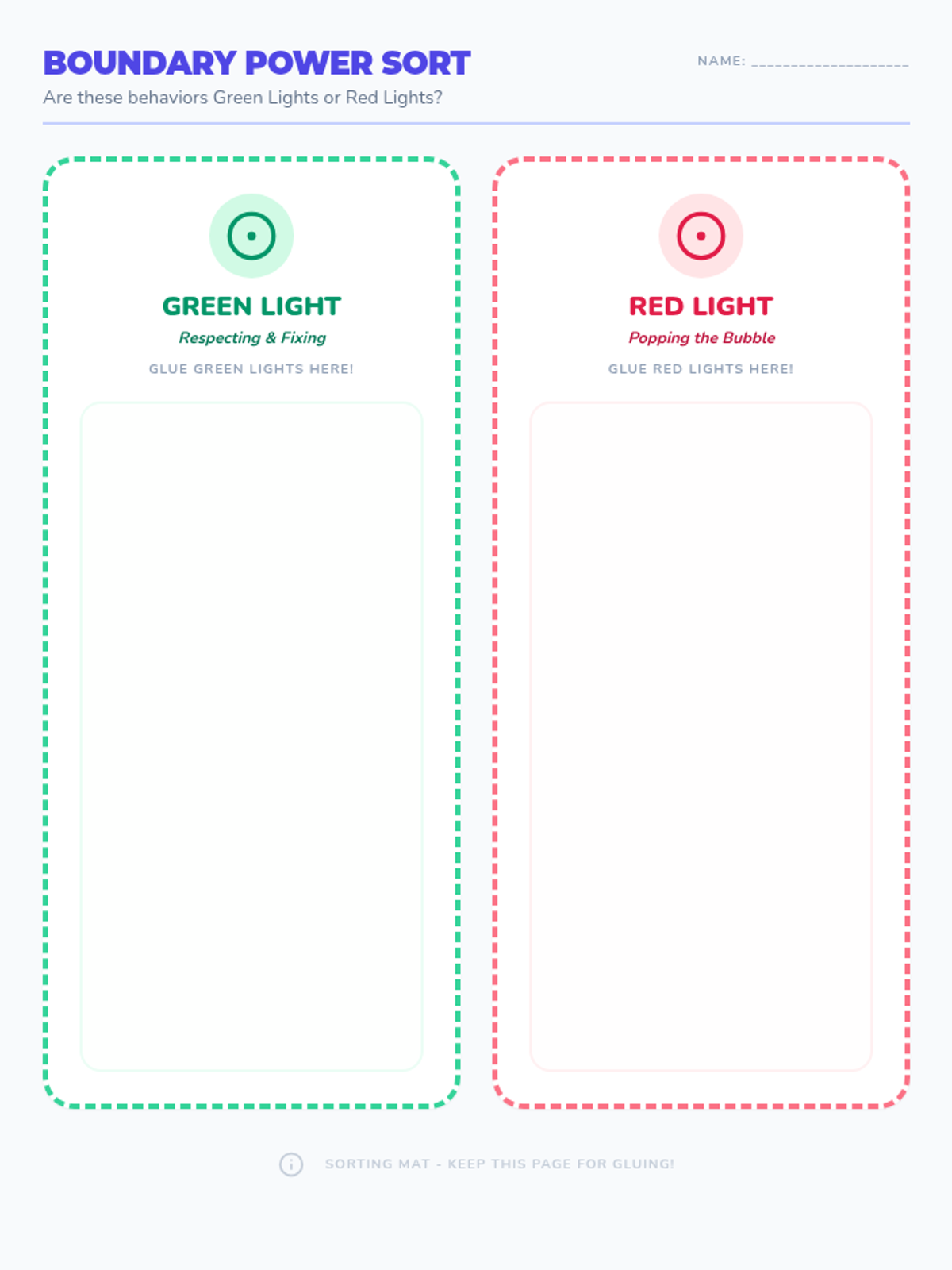 A hands-on sorting activity where students cut and paste behavior tiles into 'Green Light' (respectful) or 'Red Light' (disrespectful) categories to reinforce boundary concepts and accident resolution.
