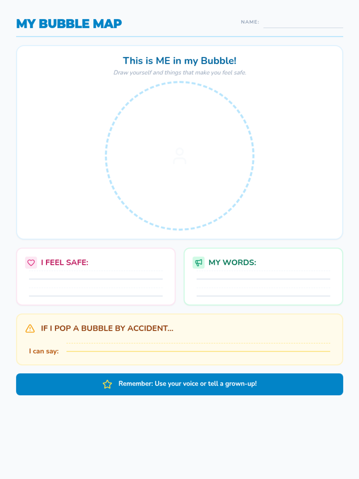 An individual student reflection worksheet where first graders draw themselves in their 'personal bubble' and identify things that make them feel safe and words they can use to set boundaries.