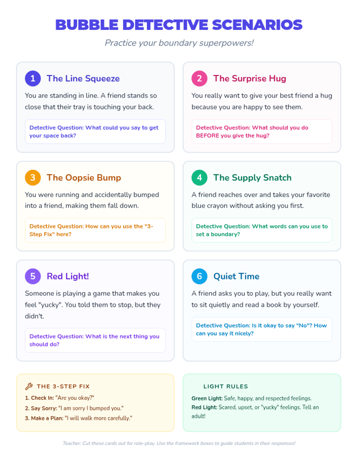 A set of 6 role-play scenario cards designed for classroom discussion or small-group activities, helping students practice responding to common boundary-related situations in a safe environment.