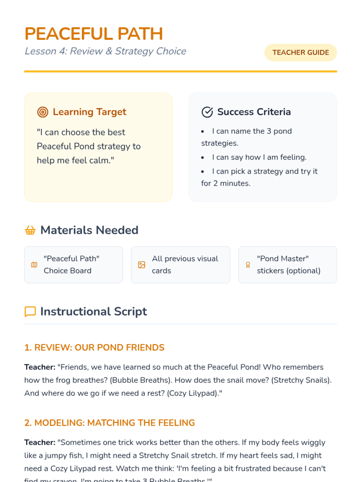 Revised teacher guide for Lesson 4 with fixed page breaks, corrected materials iconography, and improved text contrast in the footer section.