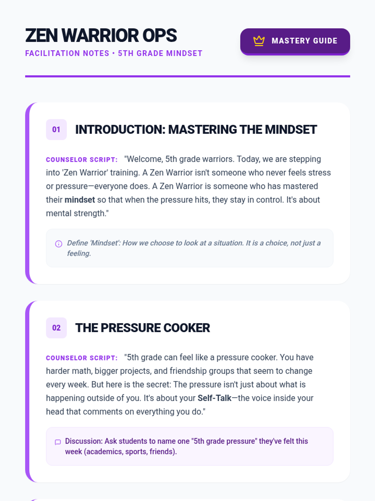 A detailed facilitation guide for the 5th grade 'Zen Warriors' lesson. Includes scripts for explaining 'Thinking Traps', 'The Flip' self-talk technique, and 'The 10-10-10 Rule' for perspective shifting.